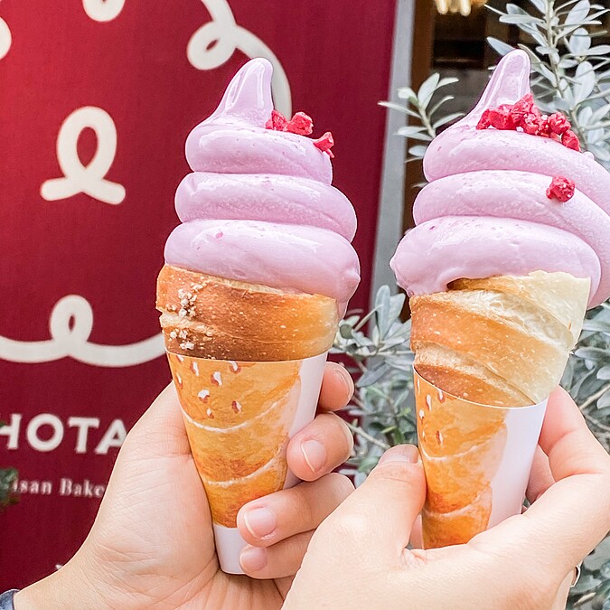 將招牌豆乳冰加入鹽漬櫻花、梔子花製成,再撒上紫紅色的鹽之花、覆盆子果粒,一支夢幻十足的櫻花粉豆乳冰淇淋就完成啦!在清甜的豆乳冰中品嚐的到細緻的鹹味,鹹甜交織出美妙風味。