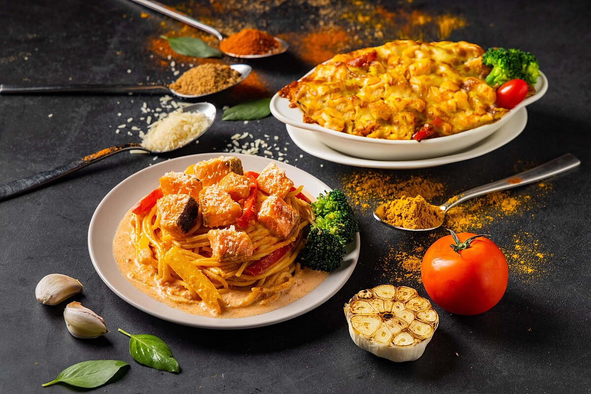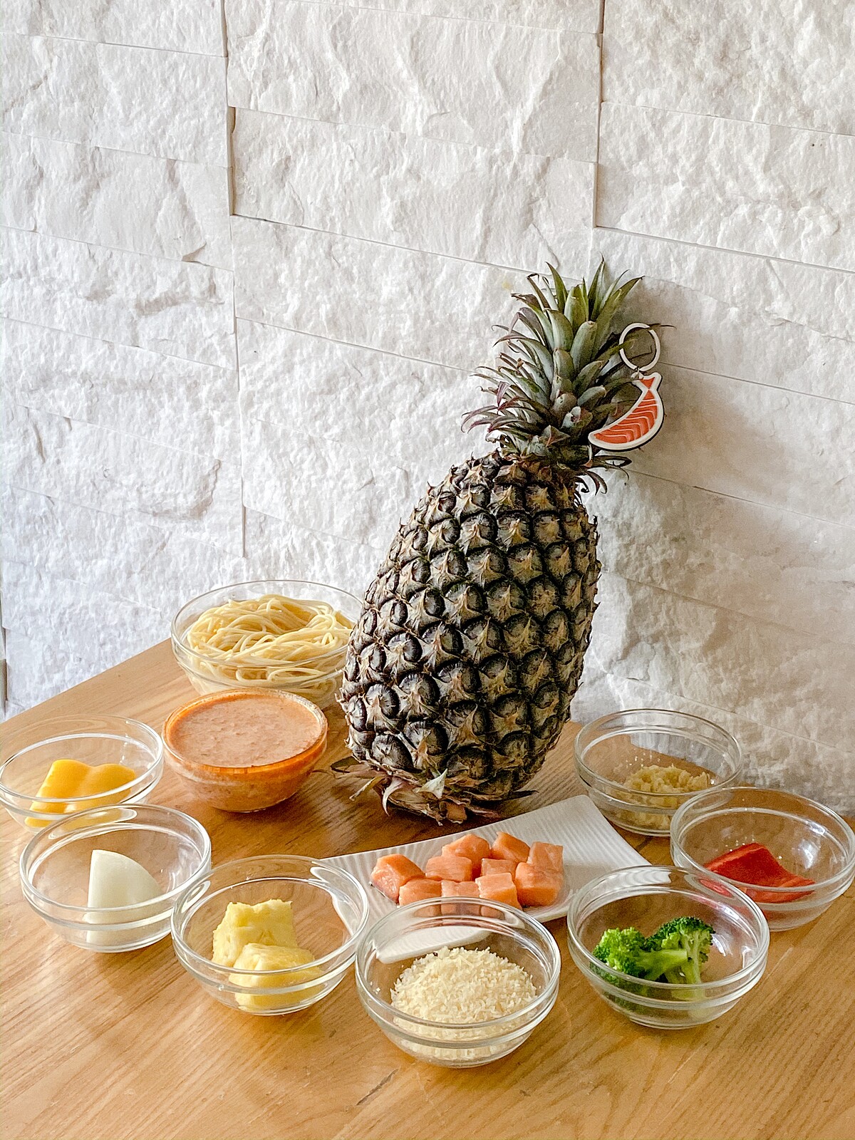 食材(1人份):鮭魚60克、花椰菜50克、紅椒15克、黃椒15克、洋蔥20克、蒜15克、鳳梨片50克、義式番茄紅醬200克、起司絲15克、熟義大利麵150克、橄欖油15克