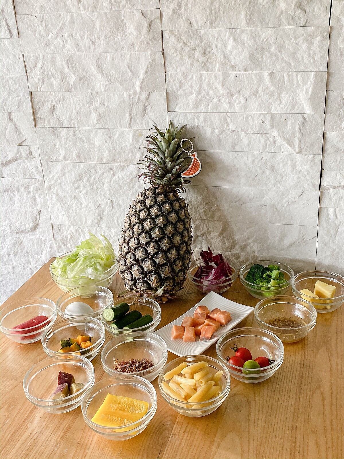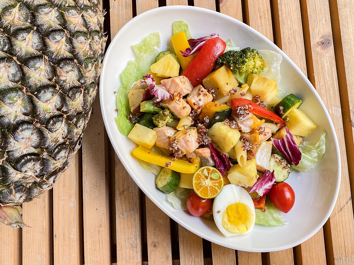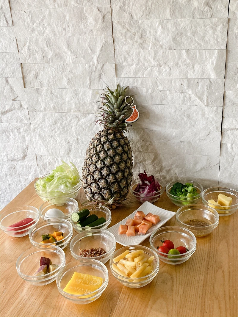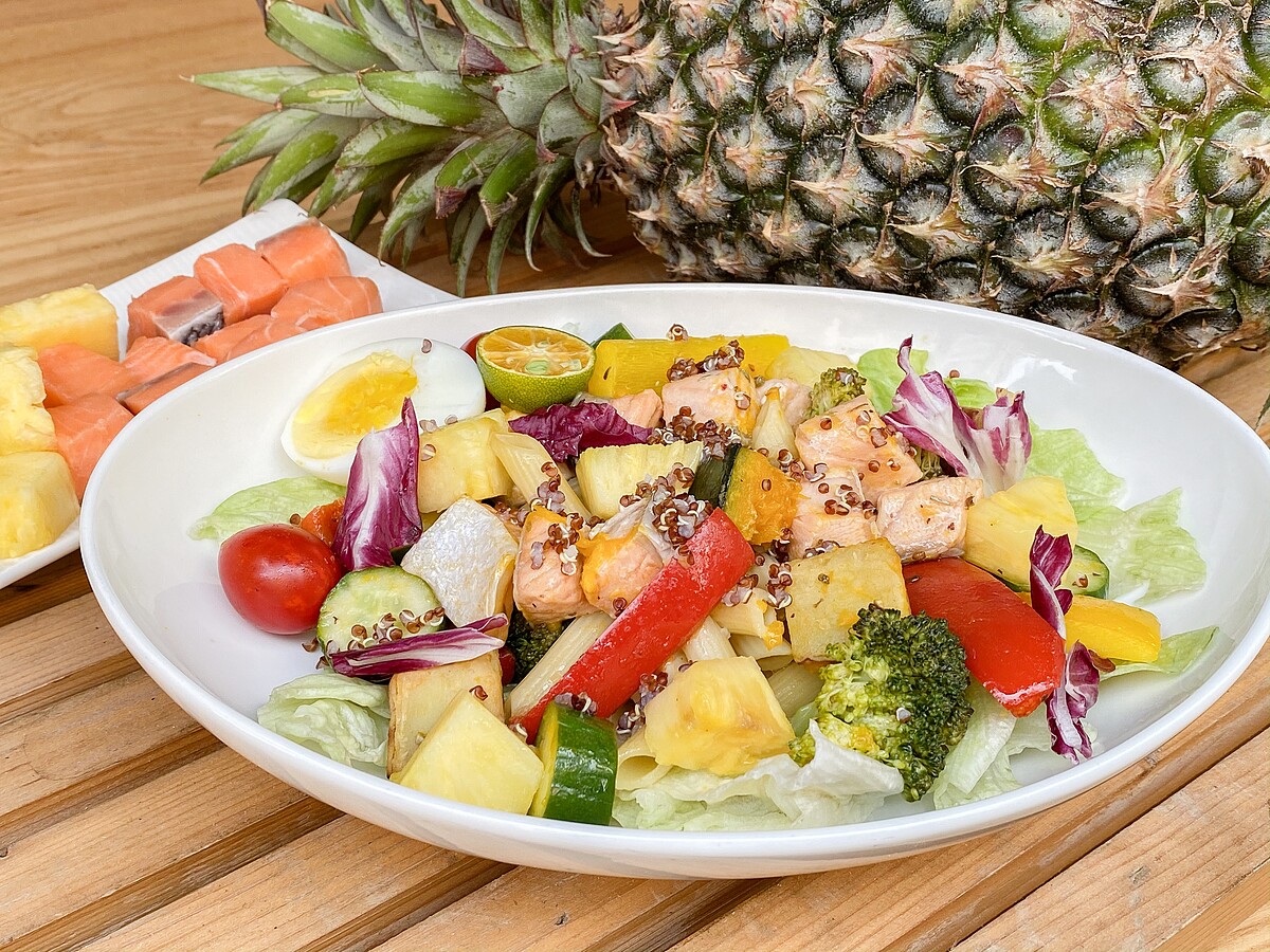 食材(1人份):鮭魚60克、美生菜50克、紅椒30克、黃椒30克、小黃瓜40克、花椰菜30克、小番茄2顆、南瓜丁30克、熟雞蛋半粒、金桔一顆、義式綜合香料2克、鹽1克、橄欖油醋醬30克、熟筆管麵75克、鳳梨塊40克、橄欖油10克、紅包心5克、熟紅黎麥、紅地瓜塊30克