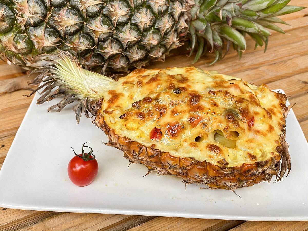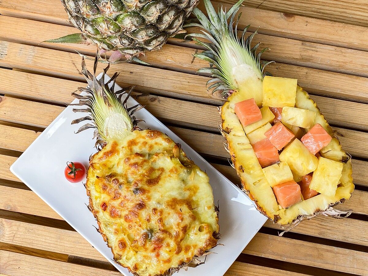 2. 將所有食材放入鳳梨盅,撒上起司絲,進烤箱烤約5-6分鐘(烤箱溫度220度),烤好表面刷油放上番茄即完成。