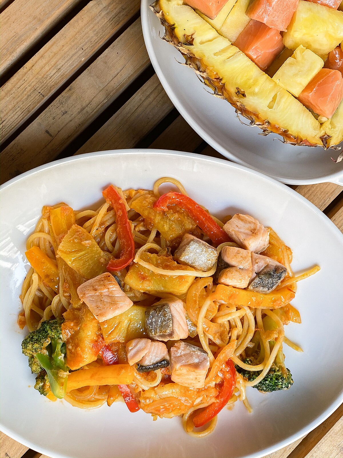 2. 鍋中放入花椰菜、紅椒、黃椒、洋蔥、蒜、鳳梨片、蒜中爆香後,加入義式番茄紅醬、義大利麵,微收汁後撒上起司絲拌勻起鍋,放入煎好的鮭魚即完成。