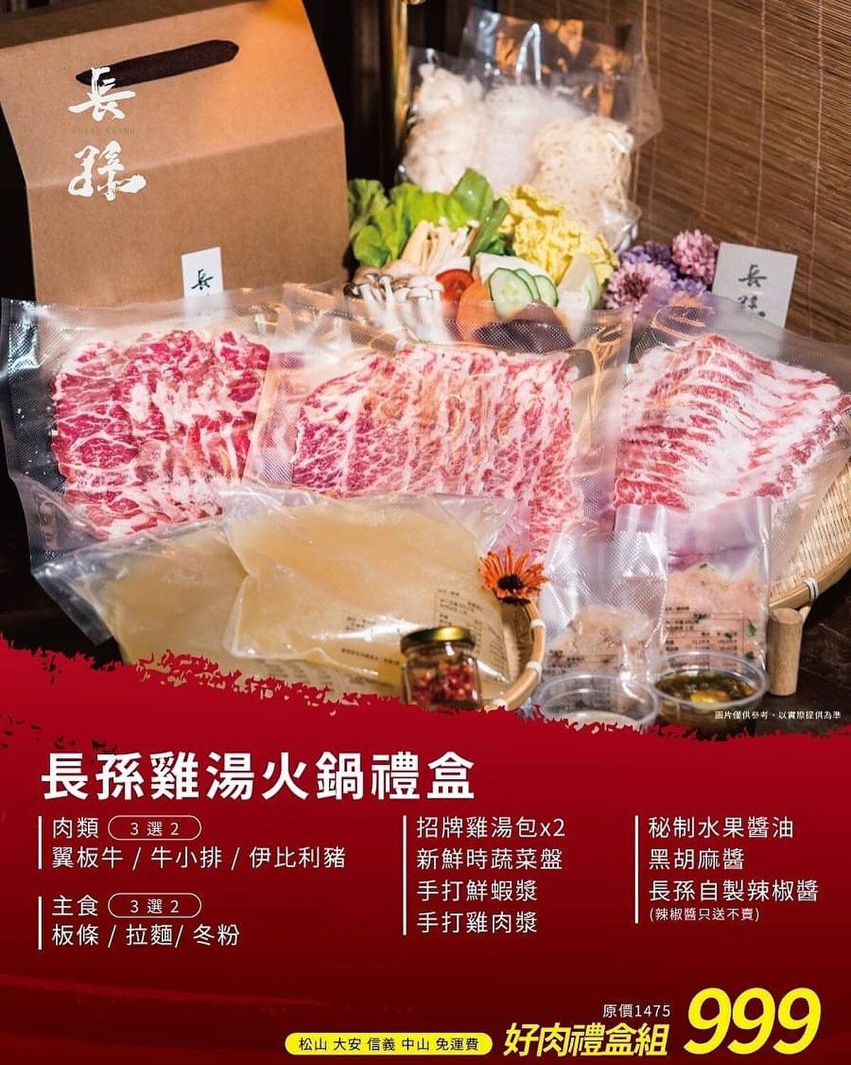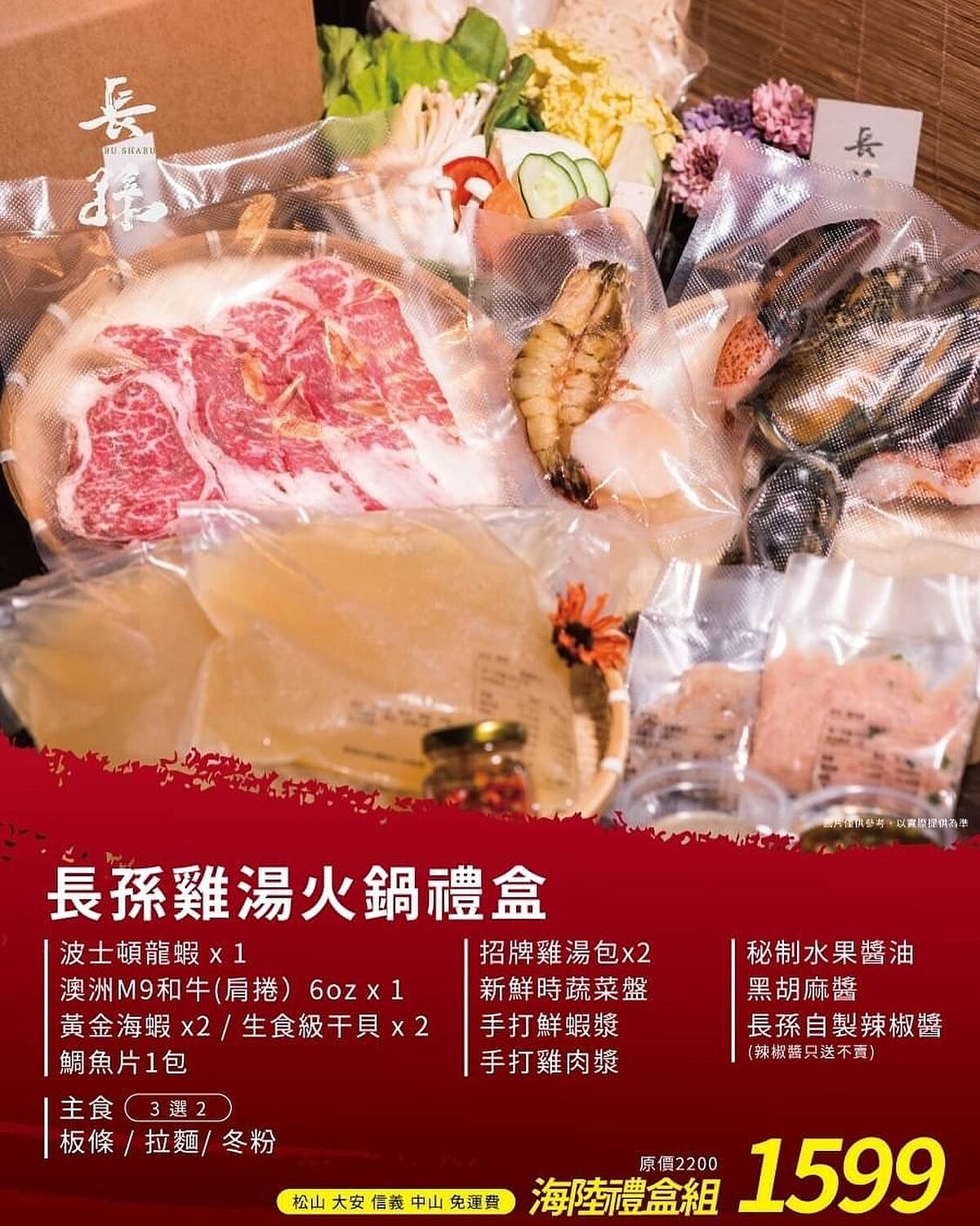 適逢疫情時期,《長孫SHABU-SHABU》也推出防疫外送禮盒啦!分別有「超值禮盒組799」、「好肉禮盒組999」以及「海陸禮盒組1599」,吃得到澳洲M9和牛、牛小排、日本生食級干貝等,還有新鮮蔬菜包,就連長孫特製辣椒醬也只送不賣,份量2人份吃相當夠,目前只提供台北市、新北市外送服務(松山、大安、信義、中山免運費)。