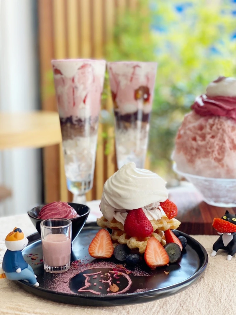 以櫻花凍與茉莉茶凍為基底,在舖上新鮮草莓果醬、新鮮水果、自製檸檬雪酪、客家湯圓、巧克力脆片,每一口都是不同的驚喜與變化,就像家裡的貓咪們一樣多變。