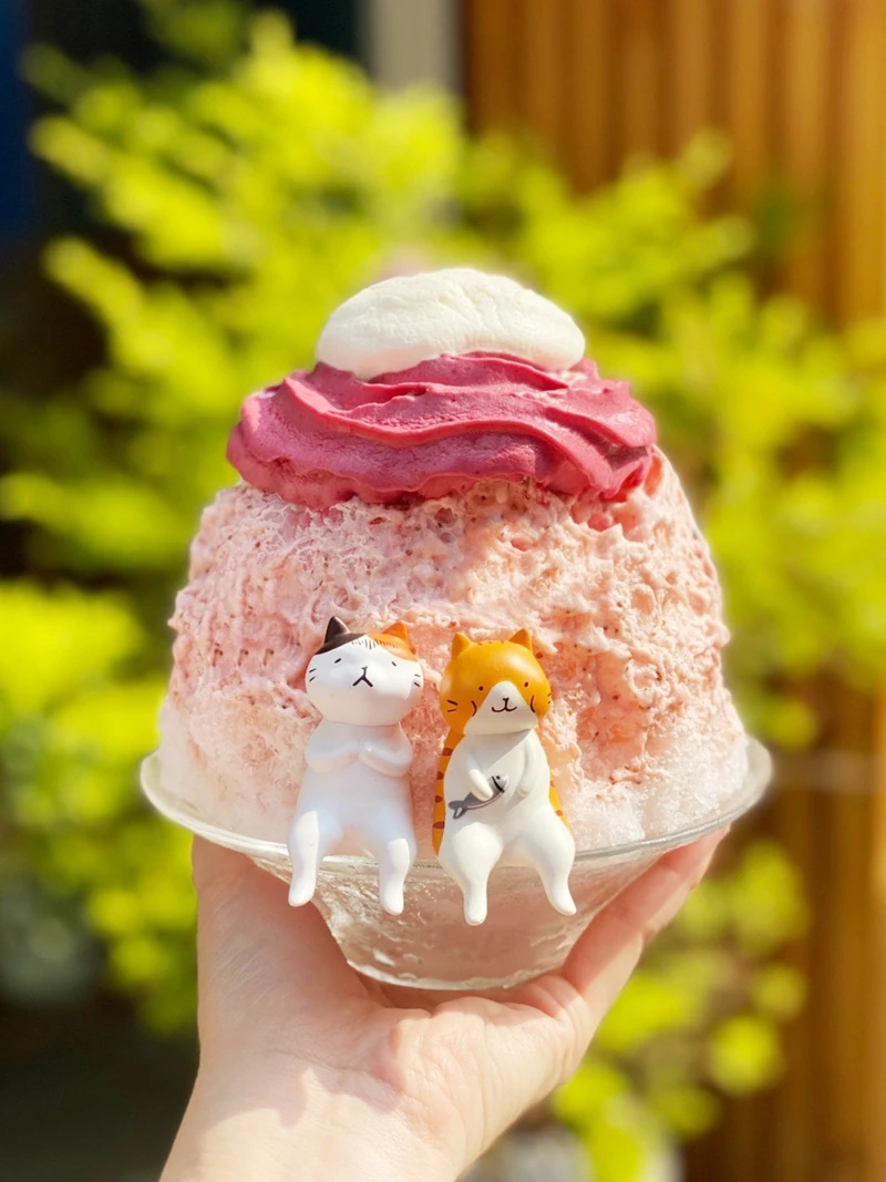 偷偷說金雞母之後會在松菸推出快閃店,春櫻草莓牛奶刨冰內餡包裹寒天蒟蒻與巧克力脆脆內餡,外觀有著粉嫩的草莓牛奶醬,上頭還有蜂蜜鮮奶espuma泡泡及乾燥覆盆莓點綴,最後插上超萌角色插牌,插牌樣式有貓小姐、反應過激的貓及懶洋洋喵之助三款,可選擇一款!