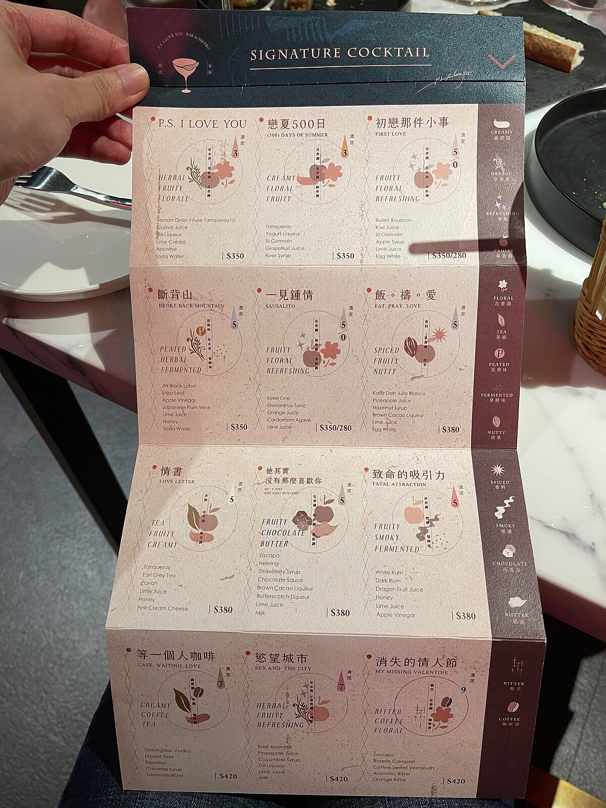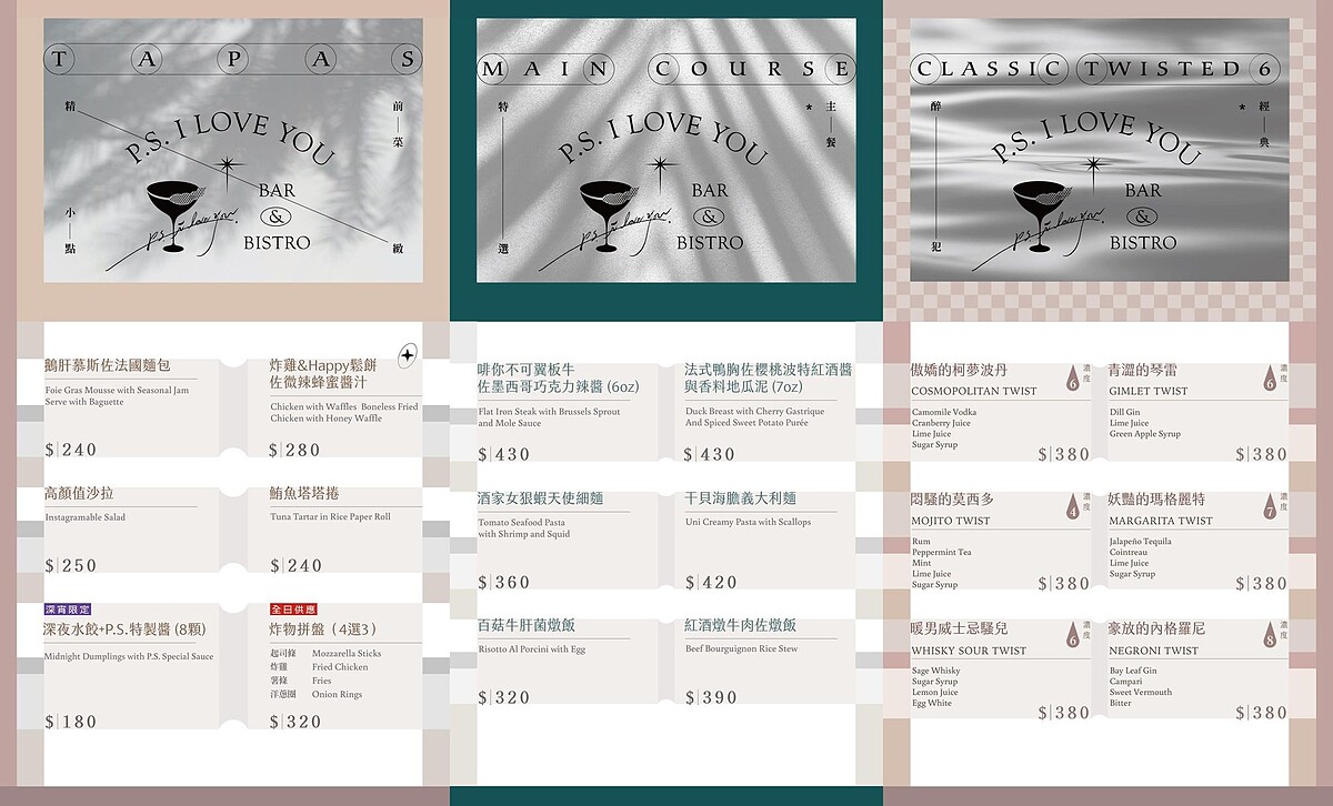 對於喜愛微醺的人,《P.S. I Love You Bar & Bistro》又多了一點趣味選擇,菜單背面特別設計成一封可以真的寫和寄的情書,店裡更提供專屬PS投遞信箱,不論地點,只要有地址和收信者,都會替客人寄信傳情。而可以看到調酒單上都是經典愛情電影名稱為靈感,從《P.S.我愛你》、《戀夏500日》、《初戀那件小事》、《斷背山》、《他其實沒有那麼喜歡你》、《慾望城市》、《等一個人咖啡》到《情書》等,由台灣調酒界新生代Kevin Luo駱威宏一手策劃人生情感特調,無論是想要為自己的愛情喝一杯,又或是趁微茫氣氛向那個他告白,在這裡,你肯定能找到那杯心靈的慰藉。