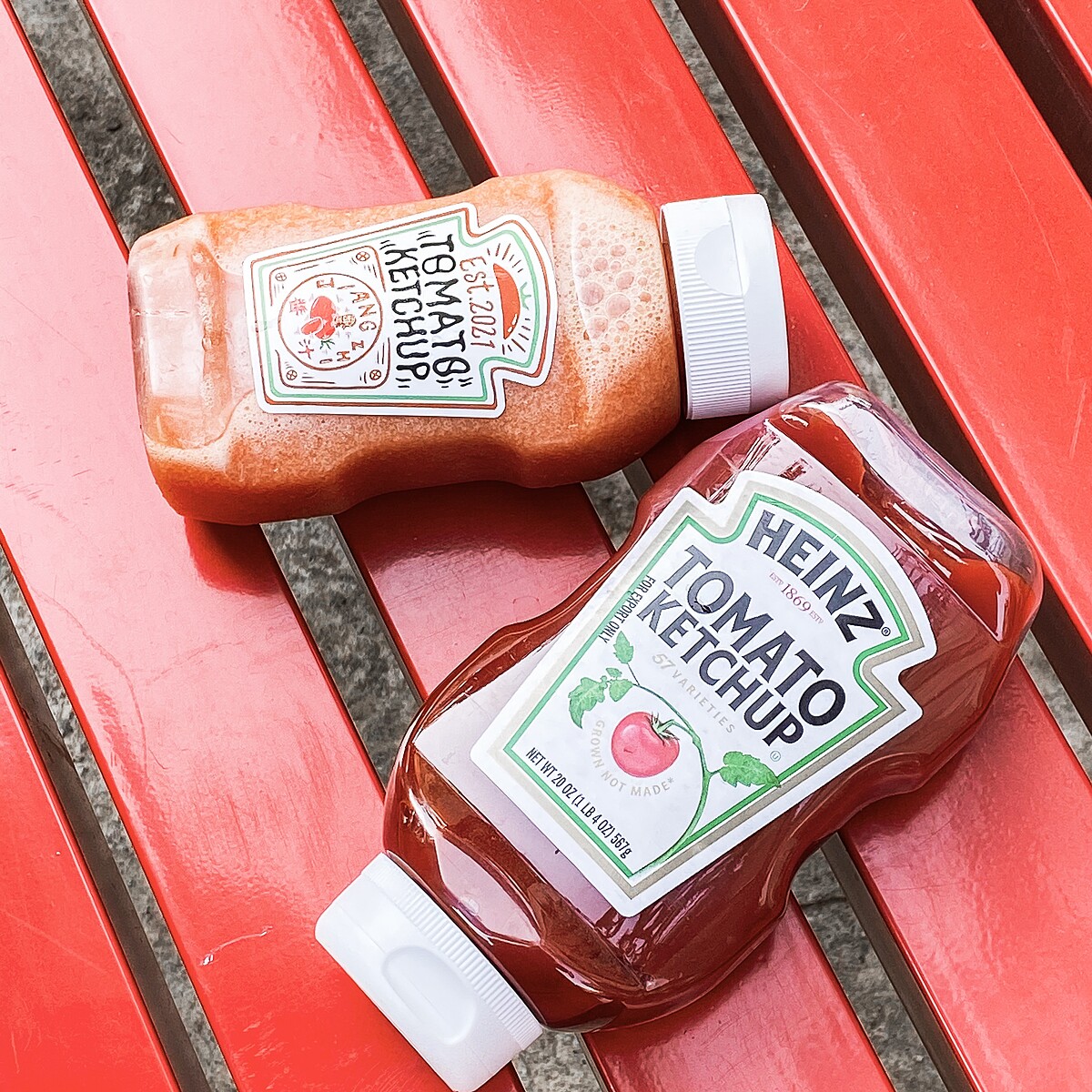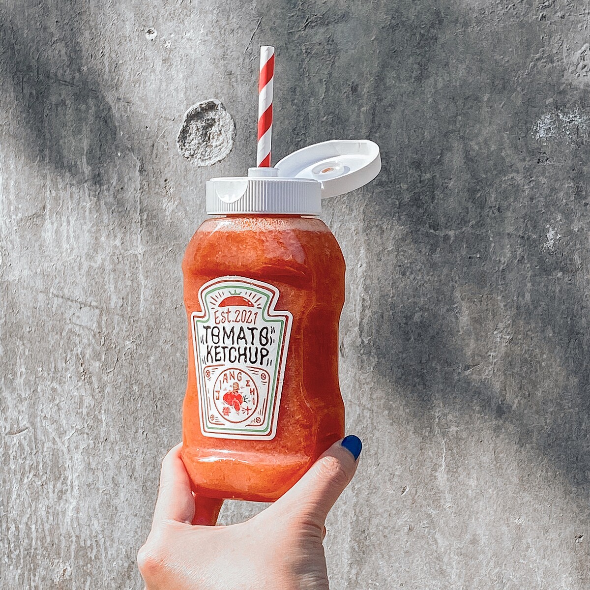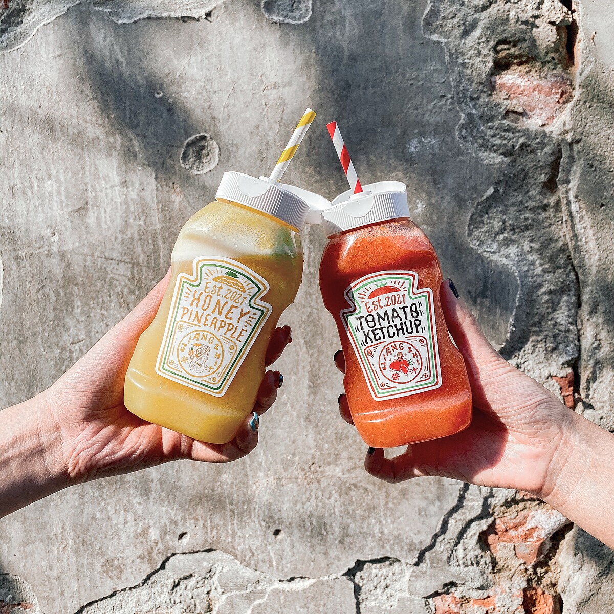 《Jiang Zhi醬汁》飲品以超趣味的番茄瓶身成為台南最新的IG人氣打卡美食,老闆以調酒的思維將水果變成無酒精的創意飲品,目前共有番茄汁、鳳梨汁2款可以選擇!