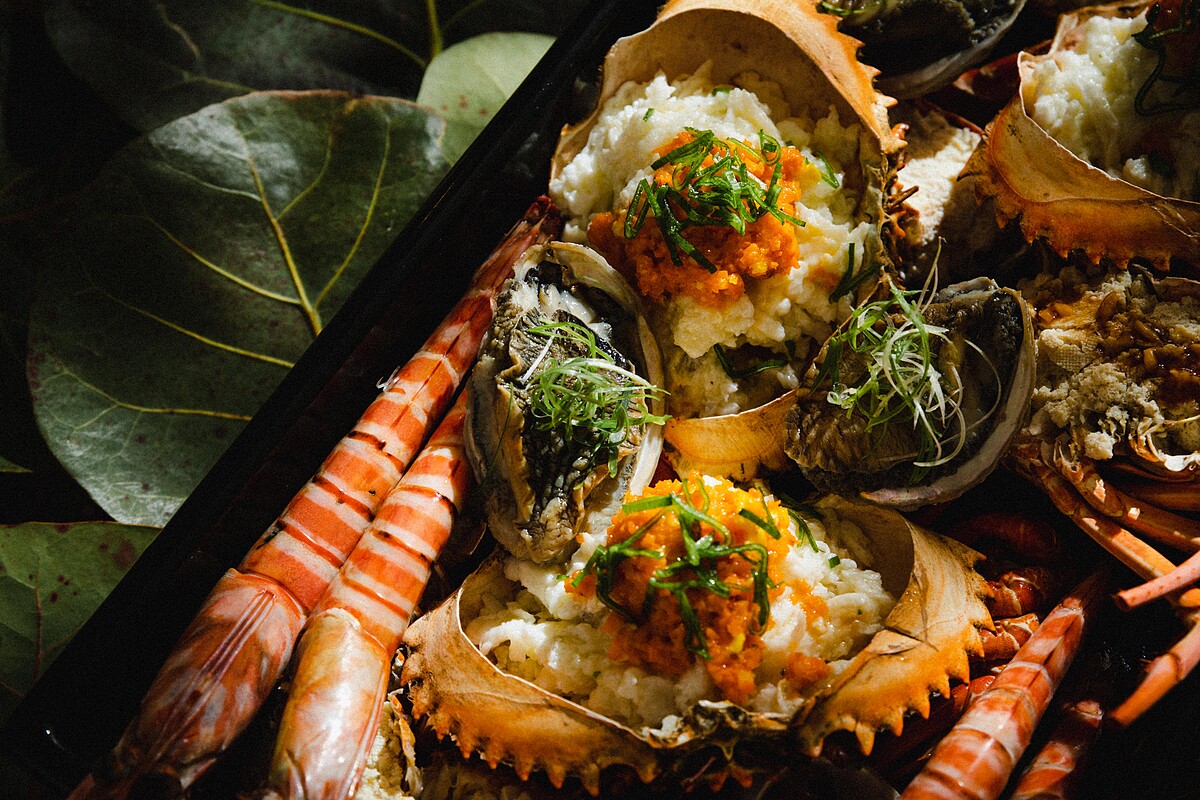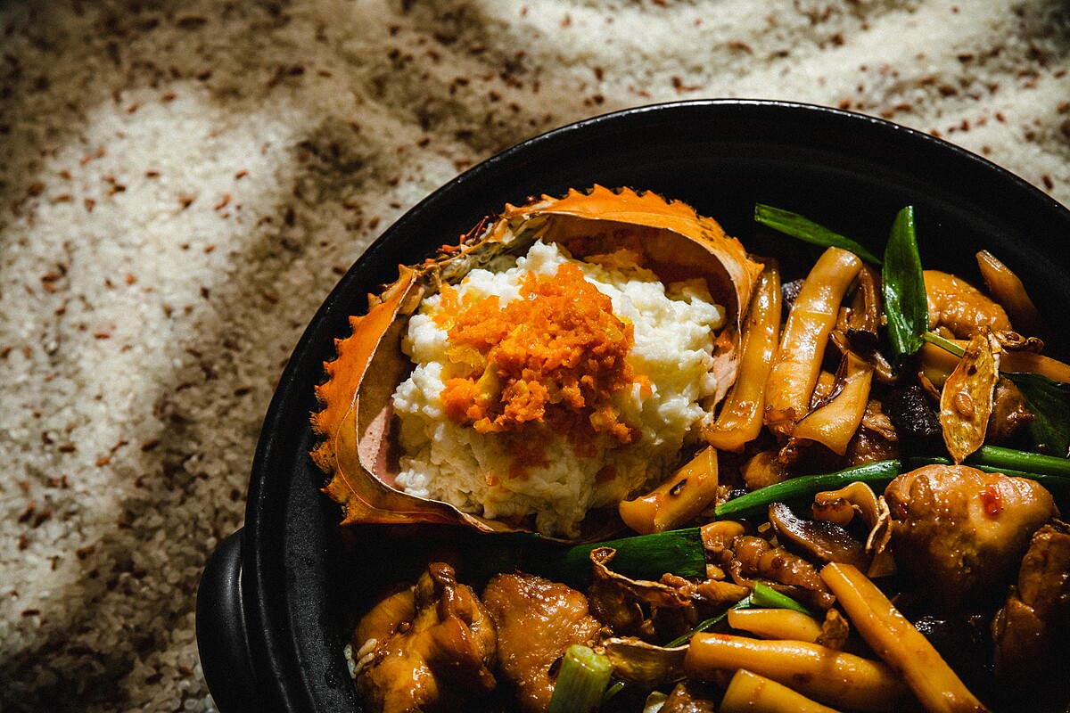 以獨家比例蒸煮並拌入手炒燉煮的滷汁自製米糕。在上頭撲滿的海鮮麻油雞使用雲林的放養自然雞與新鮮軟絲,搭配百年老店信成麻油所爆炒而成,最後加上手剝蟹肉與蟹黃醬,多層次的鮮甜滋味讓人吮指回味。