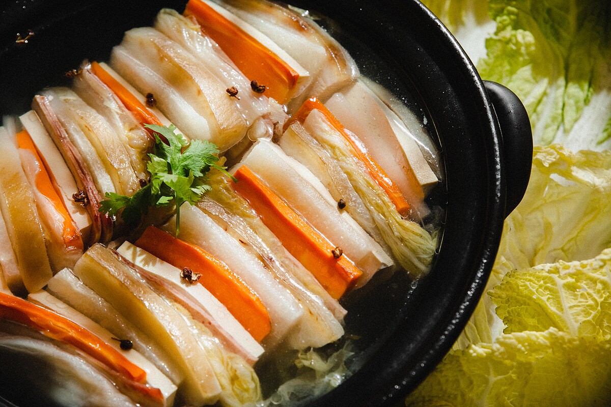 加入十種時蔬,木棉豆腐與酸白菜,搭配頂級金華火腿、放養自然雞與豬五花熬製24小時其濃縮精華的高湯。接著再將酸白菜與金華火腿的食材層層堆疊加入高湯中精心蒸煮6小時,不只在視覺上打破傳統,味覺上食材的鮮味與酸菜的酸味更碰撞出人間至味。