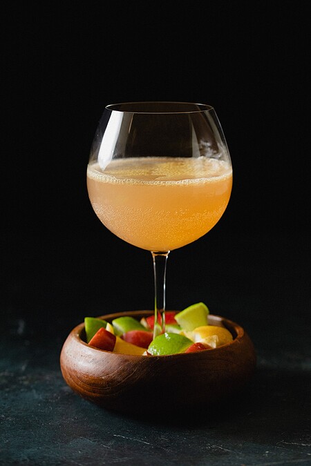 利用水梨的鮮味、蘋果的纖維再搭配情人果香氣,蔓越莓跟檸檬酸與蜂蜜提味與平衡。佐以招牌的「伯納多金黃香檳」堆疊出豐富口感,打造出一杯果香四溢香檳調酒。