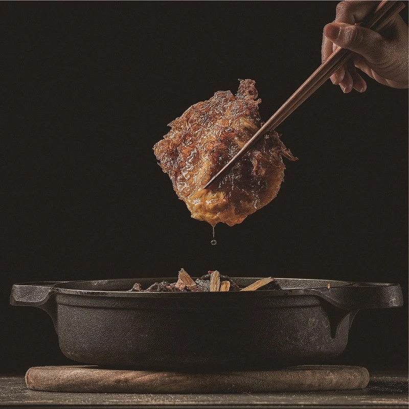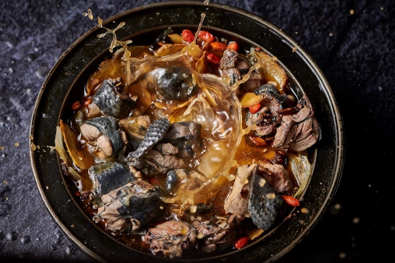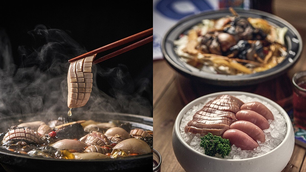 全新鍋物「燒酒雙腰烏骨雞鍋」以爆炒燒酒雞為湯底,加入經典台菜料理麻油雙腰的靈感,選用新鮮豬腰,粉粉淡紅色質地柔嫩又鮮美,經過廚房巧工處理切花,大火煮滾後入鍋只需煮30秒,即可品嘗到脆中帶著鮮嫩,與雞佛入鍋搭配即是俗稱的雙腰,兩者在燒酒雞火鍋中烹煮,雙享受同時也補足了營養,溫補不分季節。