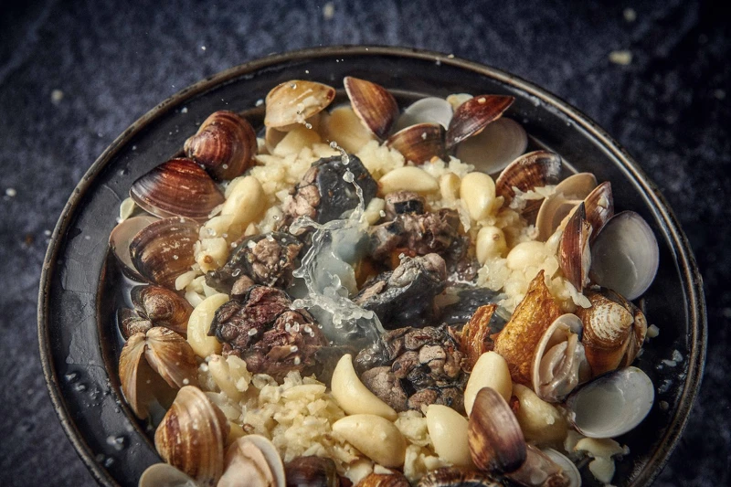 「爆炒蒜頭蛤蠣烏骨雞鍋」