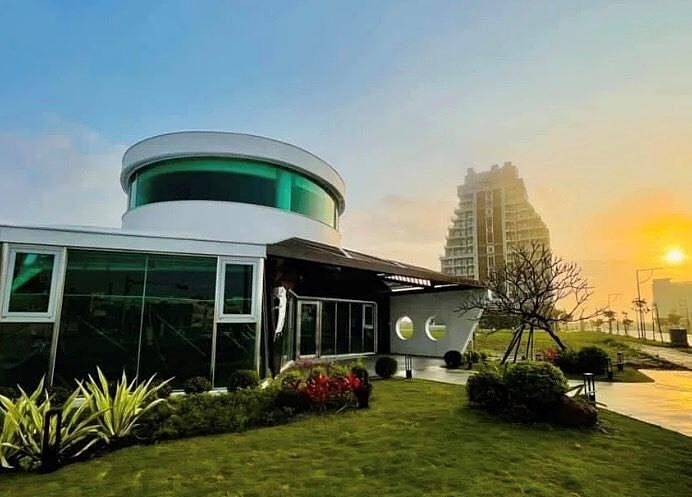宜蘭頭城門市以全白色、獨棟兩層樓的建築量體,落實了「俐落、直線、簡潔」的美學,整體以遊艇為設計意象,大面幾何形體搭配的圓形、弧線、斜線等,並結合如海水般的藍色落地玻璃,有如乘上了夢幻遊艇開啟一段海上之旅。