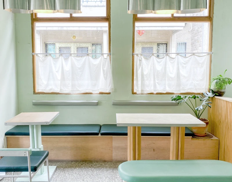 位在二樓的沼澤marsh甜點的店面大膽使用薄荷綠為主題的牆面、暖色調原木的傢俱元素、搭配老宅的磨石地板,走一種大人的可愛風格,可愛中不失質感,讓人更加放鬆舒適!