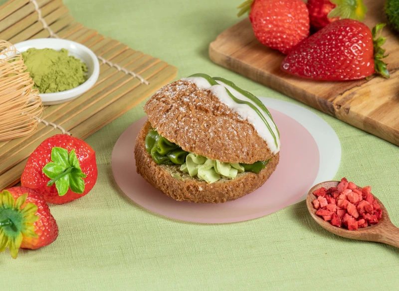 口感如泡芙般輕盈,充滿蛋香的法蘭奇,這次內餡夾入濃郁的抹茶卡士達醬,表層佐以微酸草莓白巧克力醬沾醬與草莓顆粒,喜愛清爽系風味的人首選推薦!
