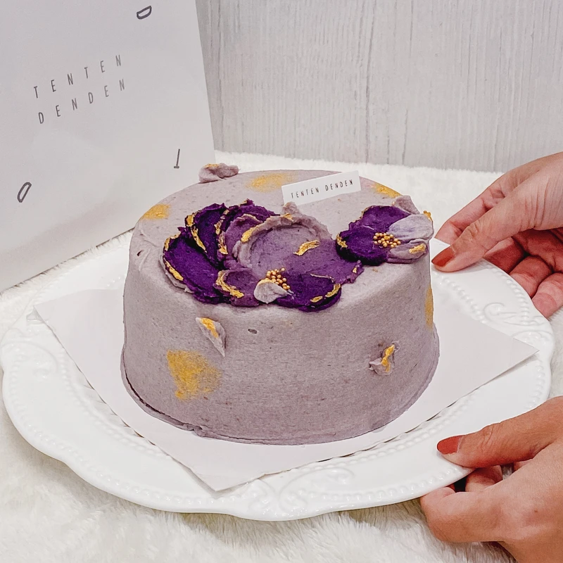 絕對會讓芋頭控尖叫!蛋糕基底以蜂蜜戚風蛋糕為主軸,加入鮮奶芋泥,再搭配鹹甜的鹹蛋黃卡士達,最上方的紫薯豆沙宛如油畫顏料變成瓣瓣紫花,非常典雅細緻!