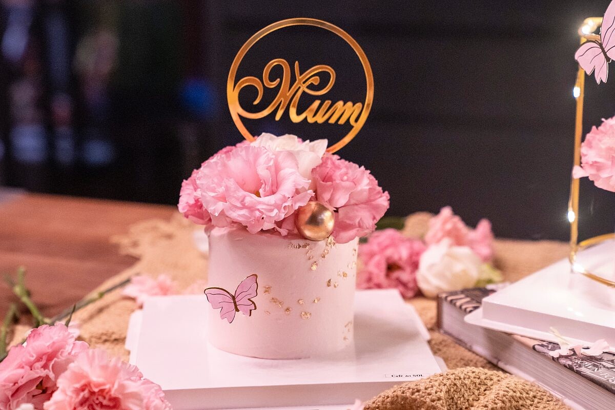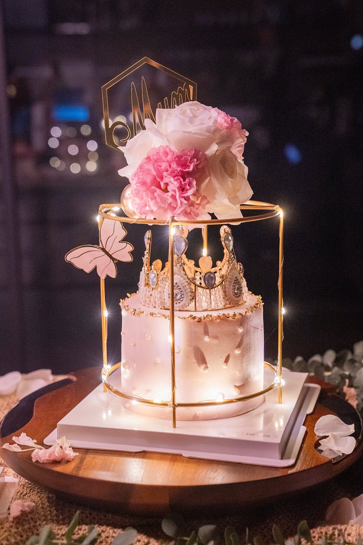 外觀以我的秘密花園為發想,在蛋糕上面不只佈滿了鮮花,在一旁還有蝴蝶翩翩起舞,以金箔點綴飛行的蹤跡,真的是太美了!