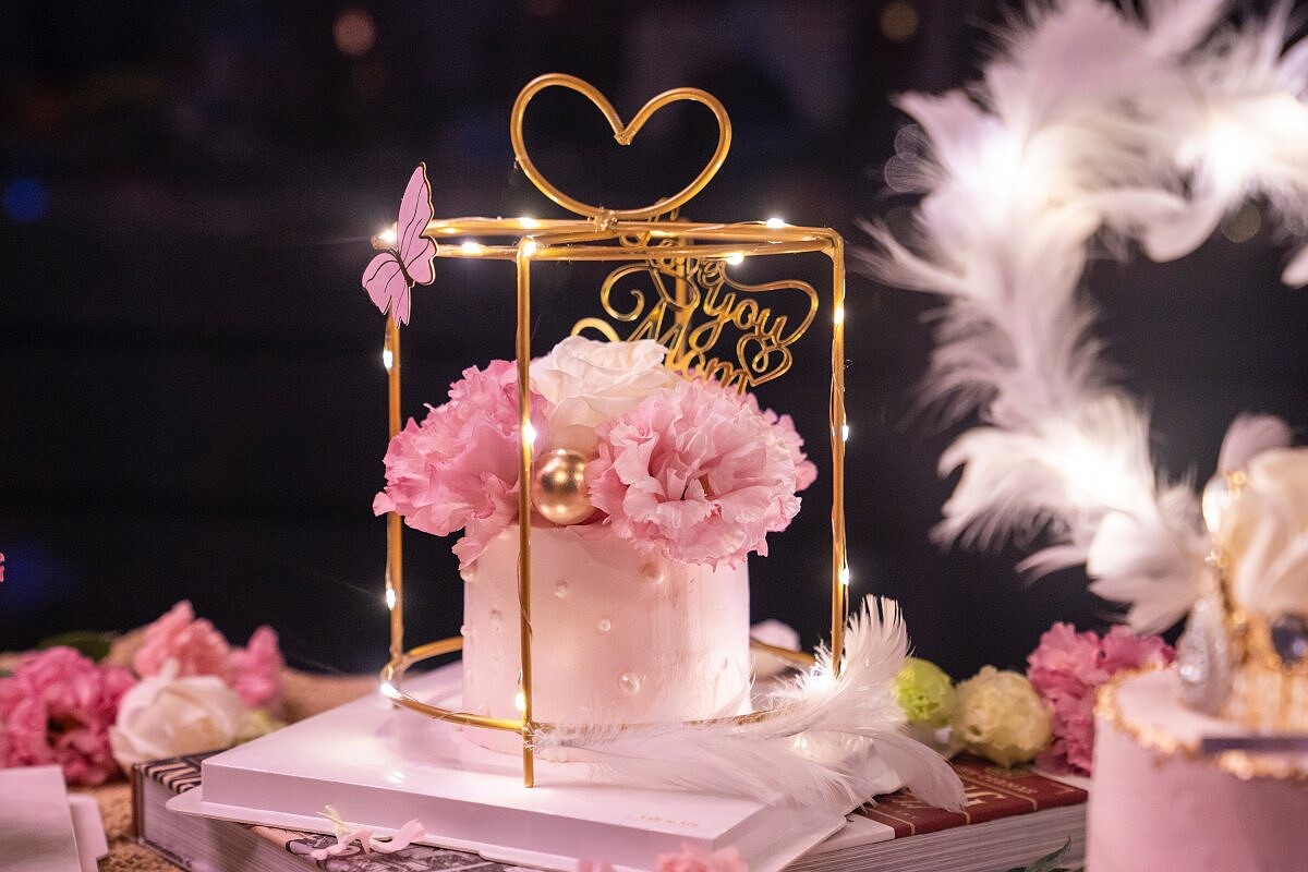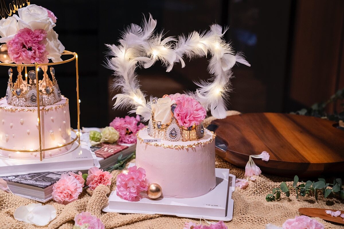 結合粉紅色鮮花與燈,神秘之中帶有許多的溫馨之處,鮮花與淡粉色蛋糕點綴在金屬架上面,開燈的瞬間真的讓人好驚艷!