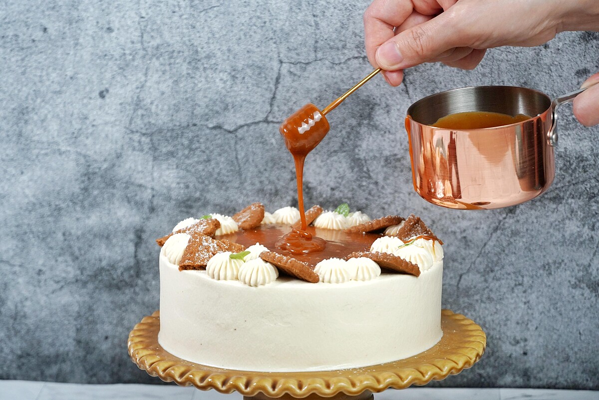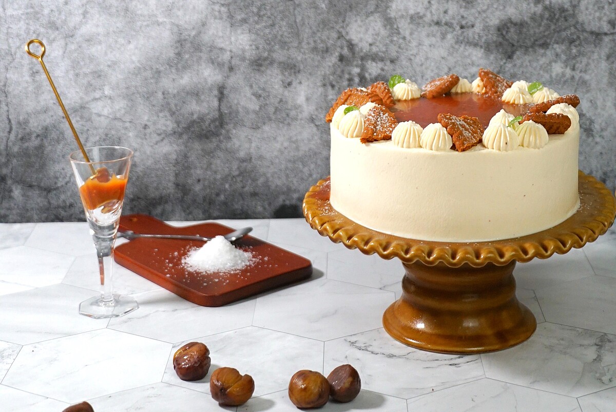 選用知名的馬卡龍之父「Pierre Herme」的海鹽焦糖醬作為主角。將鮮奶油與海鹽焦糖醬融合在一起,做出兩種層次不同的風味抹在蛋糕裡外,再搭配栗子奶霜去中和甜膩感。
