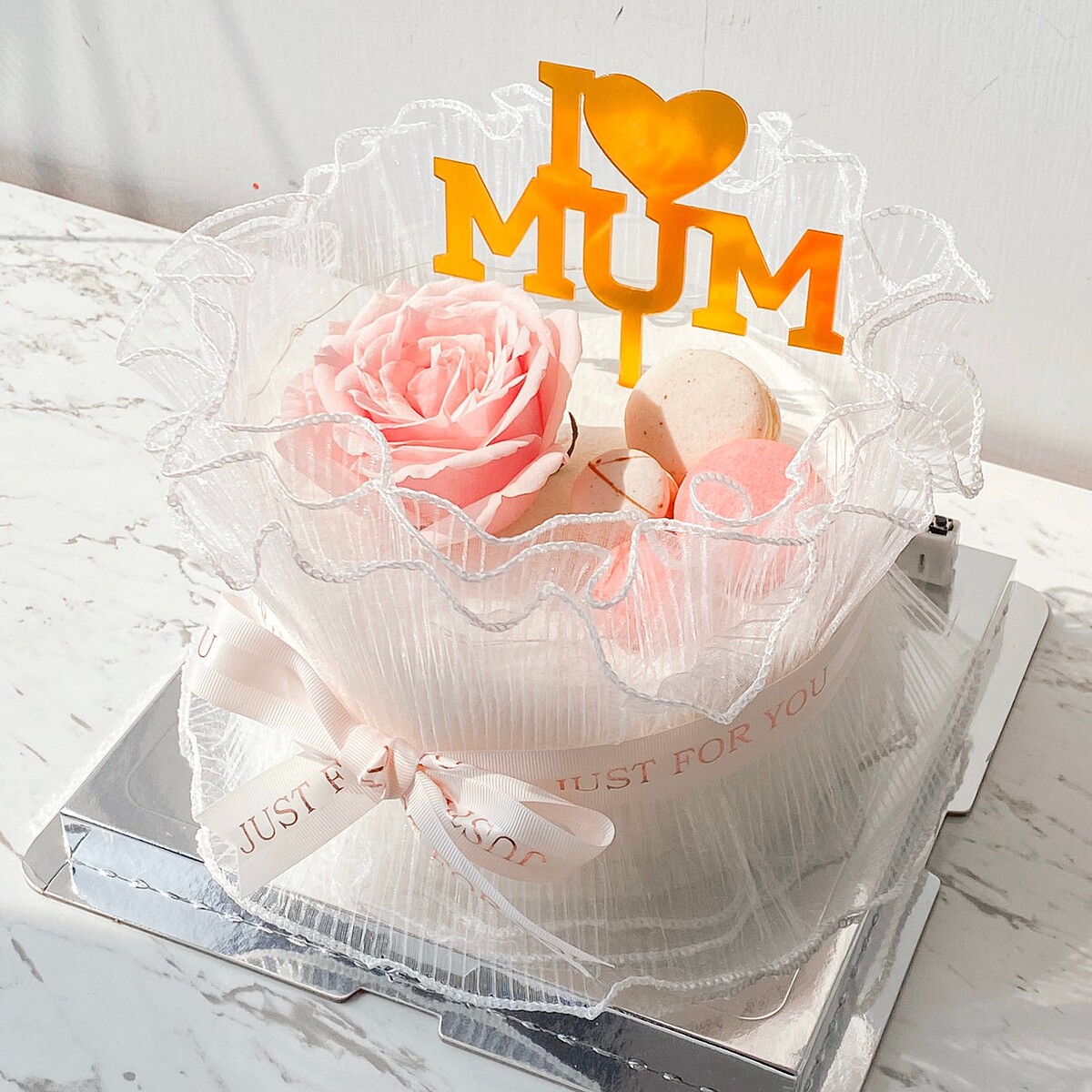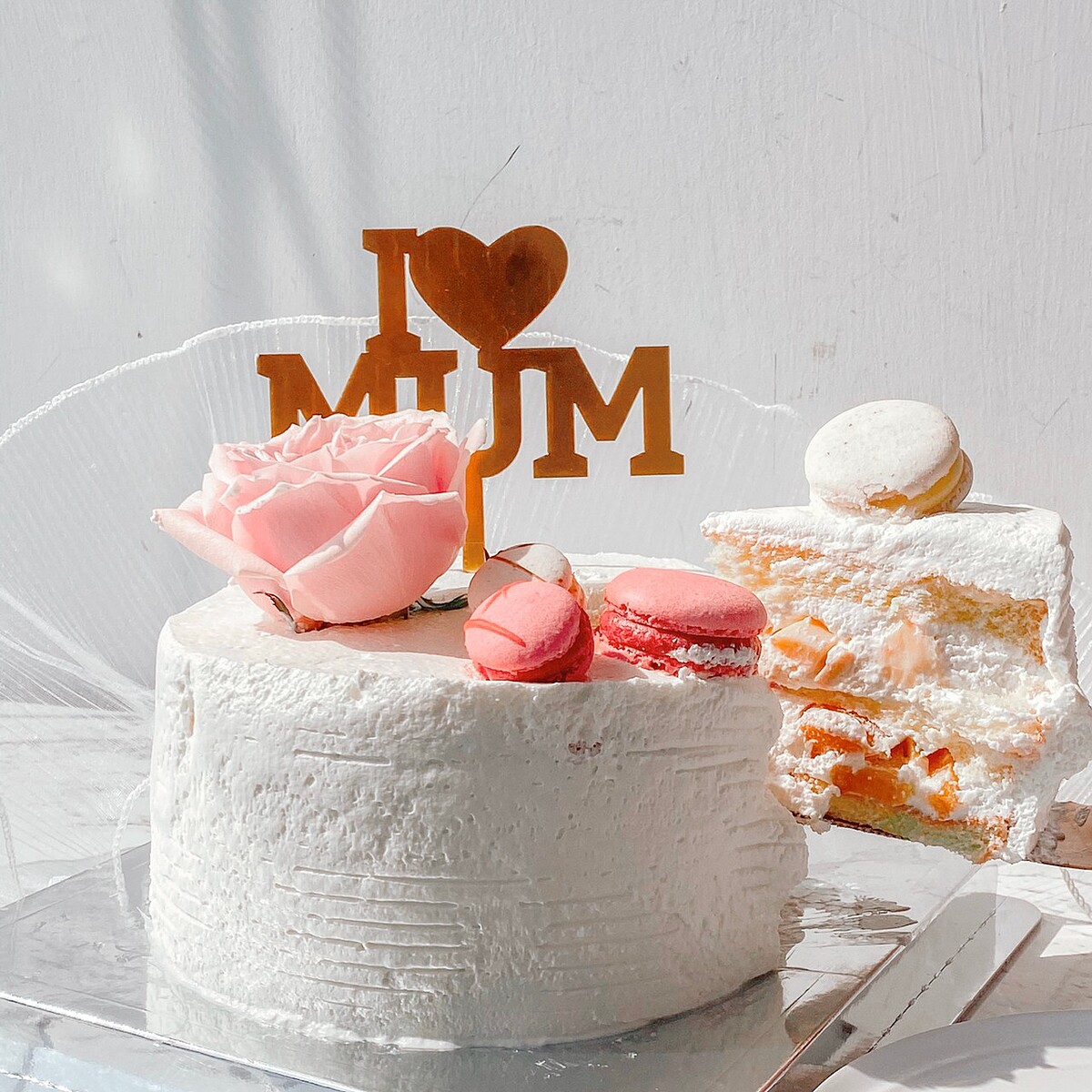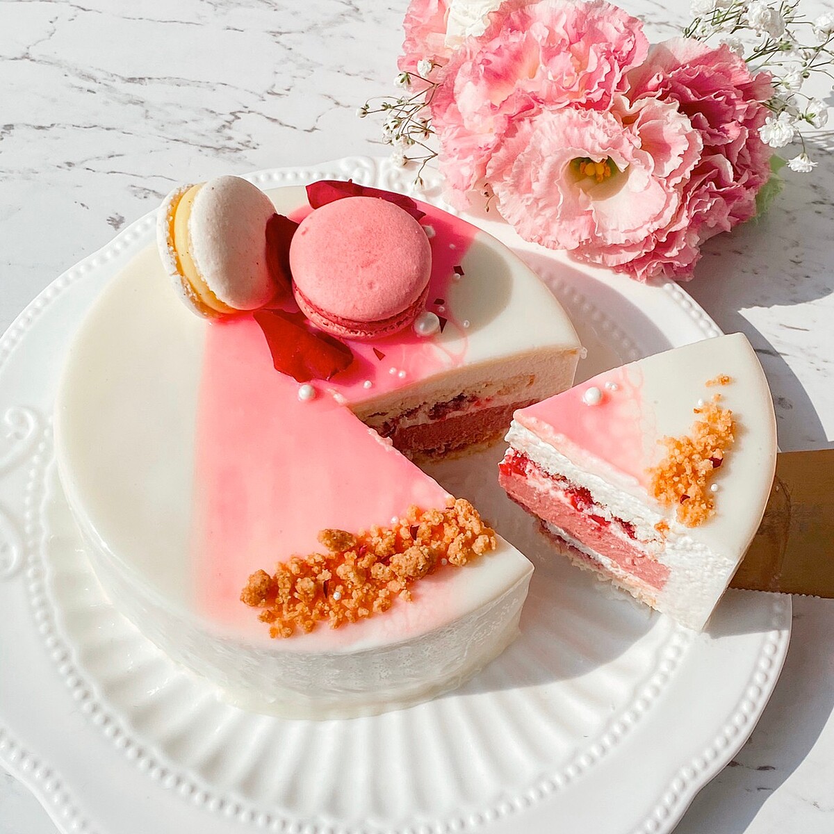 蛋糕的外觀宛如花束非常漂亮,純白的又優雅的蛋糕以濕潤蓬鬆的戚風蛋糕為基底。