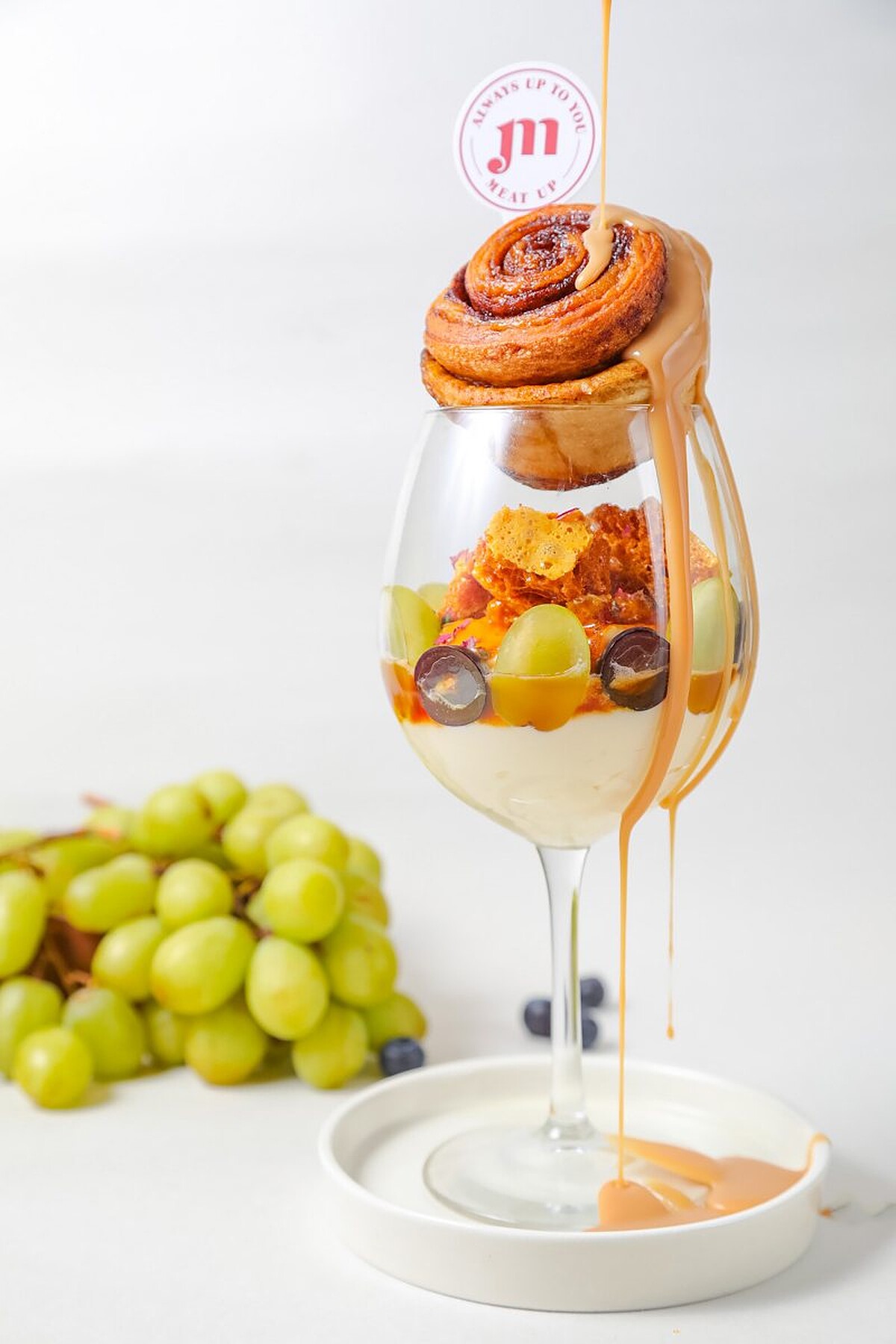 將清爽的檸檬乳酪醬填入酒杯中,再加入無籽白葡萄、藍莓及焦糖脆脆,最後在杯口放上肉桂捲,讓甜點搖身一變變成一杯浮誇的雞尾酒造型,也可以再搭配一旁的濃郁焦糖醬,品嚐起來別有一番風味。