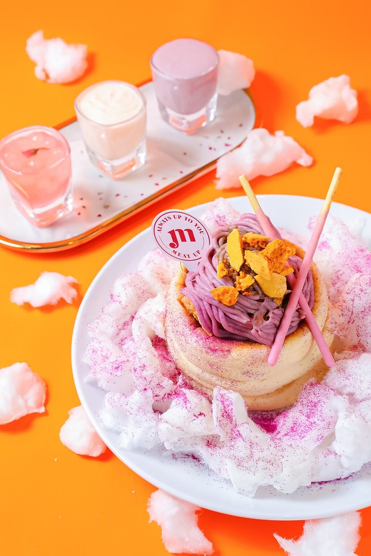 以鬆軟綿密的舒芙蕾為基底,頂端擺上千層酥後,最後擠上滿滿的芋泥蒙布朗,再撒上焦糖脆脆更增添口感層次,盤子的邊緣以棉花糖來裝飾,真的太夢幻了,另外附上馬斯卡朋乳酪、芋泥及白玉櫻花醬,可依個人喜好搭配享用。