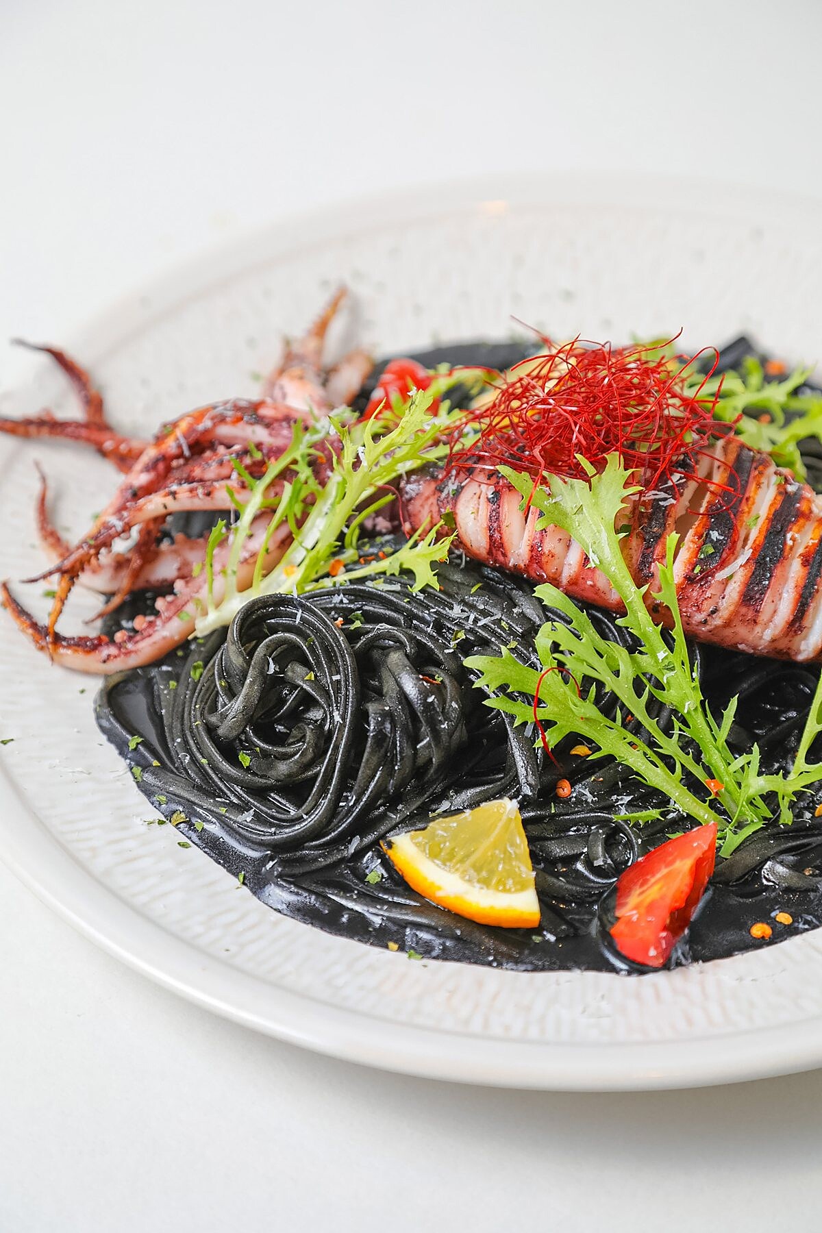 將義大利麵清炒過後,再加入墨魚汁翻炒至上色,最後擺上一整隻的花枝,每一口都能感受清爽鮮甜的海鮮風味。