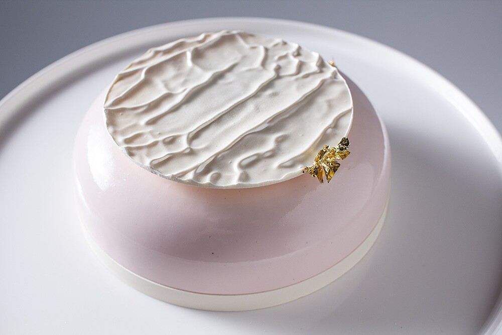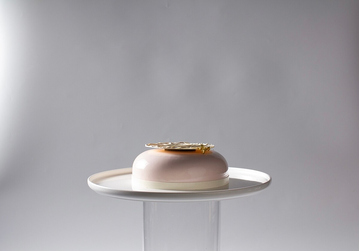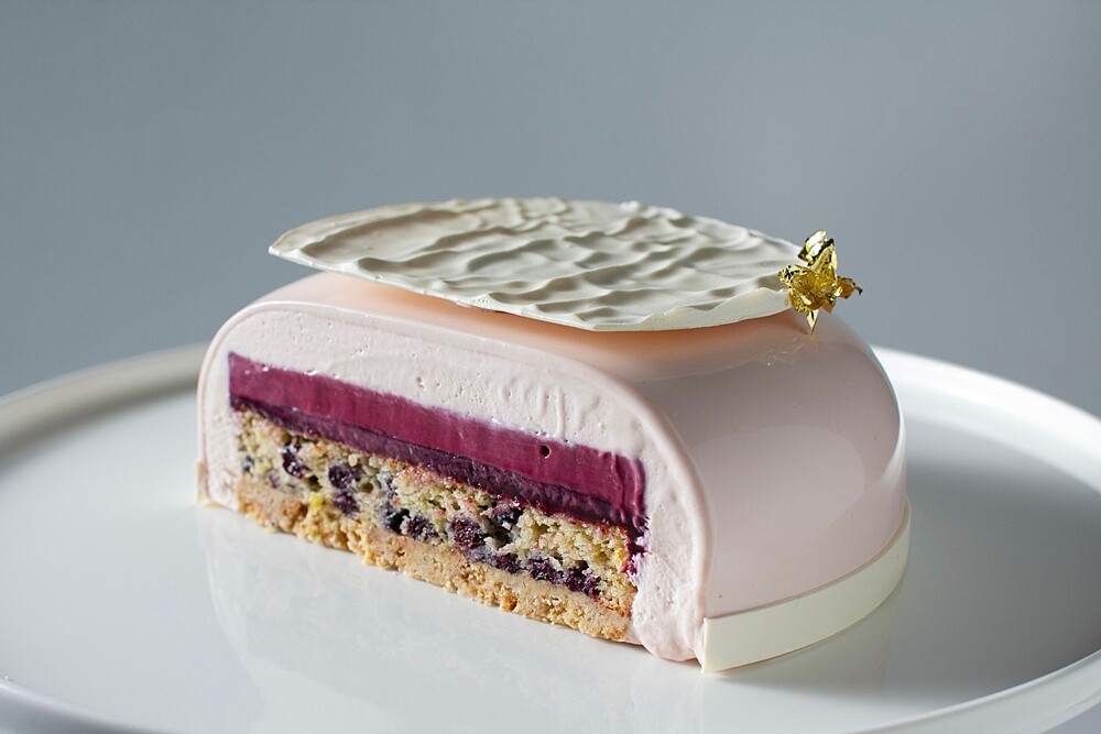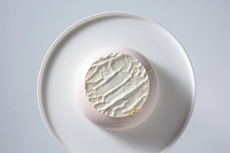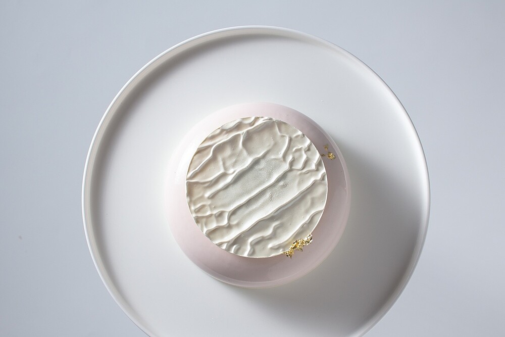 從外型來看,蛋糕上方用一片巧克力片呈現出如月球表面的視覺效果,搭襯溫柔底色顯得更加明亮,便如同你我心中母親的「微光」,為蛋糕注入浪漫及溫柔意象。內餡也是極具工夫的作品,蛋黃醬、果醬皆是歷經48小時的黑醋栗低溫發酵萃取而來,外部帶有淡紫色的慕斯,則是將花瓣浸泡超過24小時所提煉出來的真實香氣。