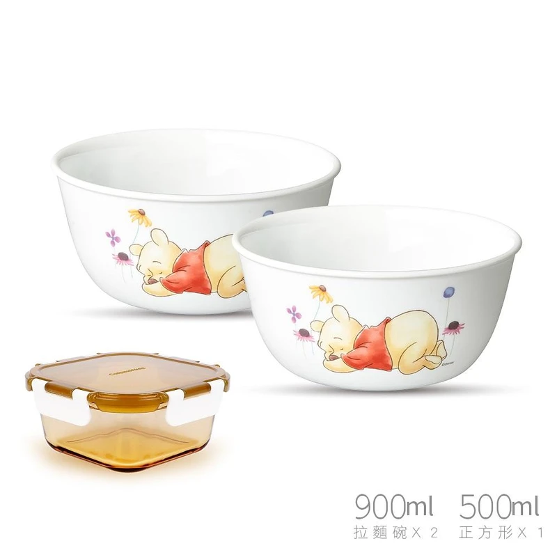 小熊維尼系列900ml拉麵碗X2個,Pyrex正方型500ml透明保鮮盒