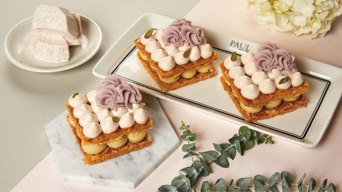 PAUL人氣款千層派口味再創新!獨家研發「芋泥千層派」讓芋頭控為之瘋狂!以兩片法國直送的派皮擠入主廚特製的芋泥卡士達,最後在派皮表層擠上芋頭香緹、芋泥擠花與開心果點綴,入口後交織著酥脆派皮、柔順的卡士達與香氣四溢的芋頭香,共同在舌尖轉為幸福的甜蜜口感。