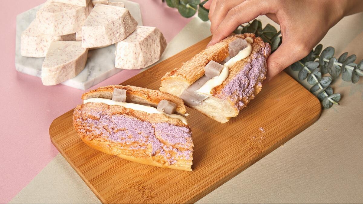 因應消費者瘋迷芋頭甜點的趨勢,PAUL研發「芋泥雙餡麵包」,使用鮮奶吐司製作成長型麵包,夾入優格乳酪、蜜芋頭丁、純芋頭餡,最後在表層放上微堅果香味的酥皮增加口感,並灑上紫薯糖粉點綴,一口咬下,豐富多重奏口感令人驚豔。