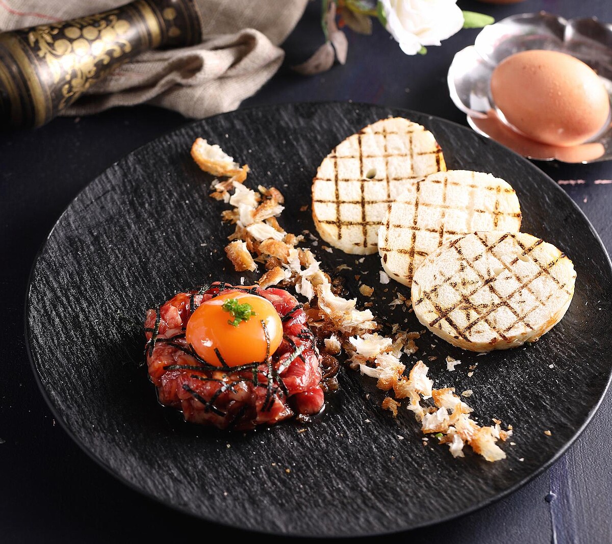 選用日本和牛與澳洲和牛各半,讓日本和牛的油脂香氣與澳洲和牛的肉感風味完美結合。再拌入特製燒肉醬,撒上蝦夷蔥提味,搭配蛋黃與生牛肉、油條碎拌勻享用,肉口感受軟脆交錯的多層次口感,也可以搭配炭烤至外酥內軟的起司軟法一起享用別有一番風味。