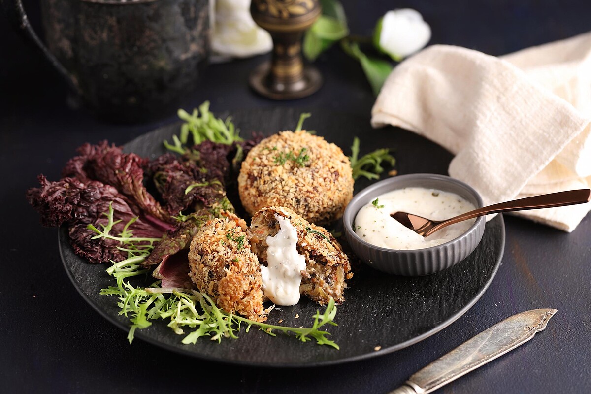 嚴選日本松葉蟹腳肉融合洋菇、洋蔥,裹上新鮮麵包粉炸至金黃酥脆,一口咬下吃得到蟹肉的鮮甜滋味,也可以佐以酸奶醬讓風味更加清爽。