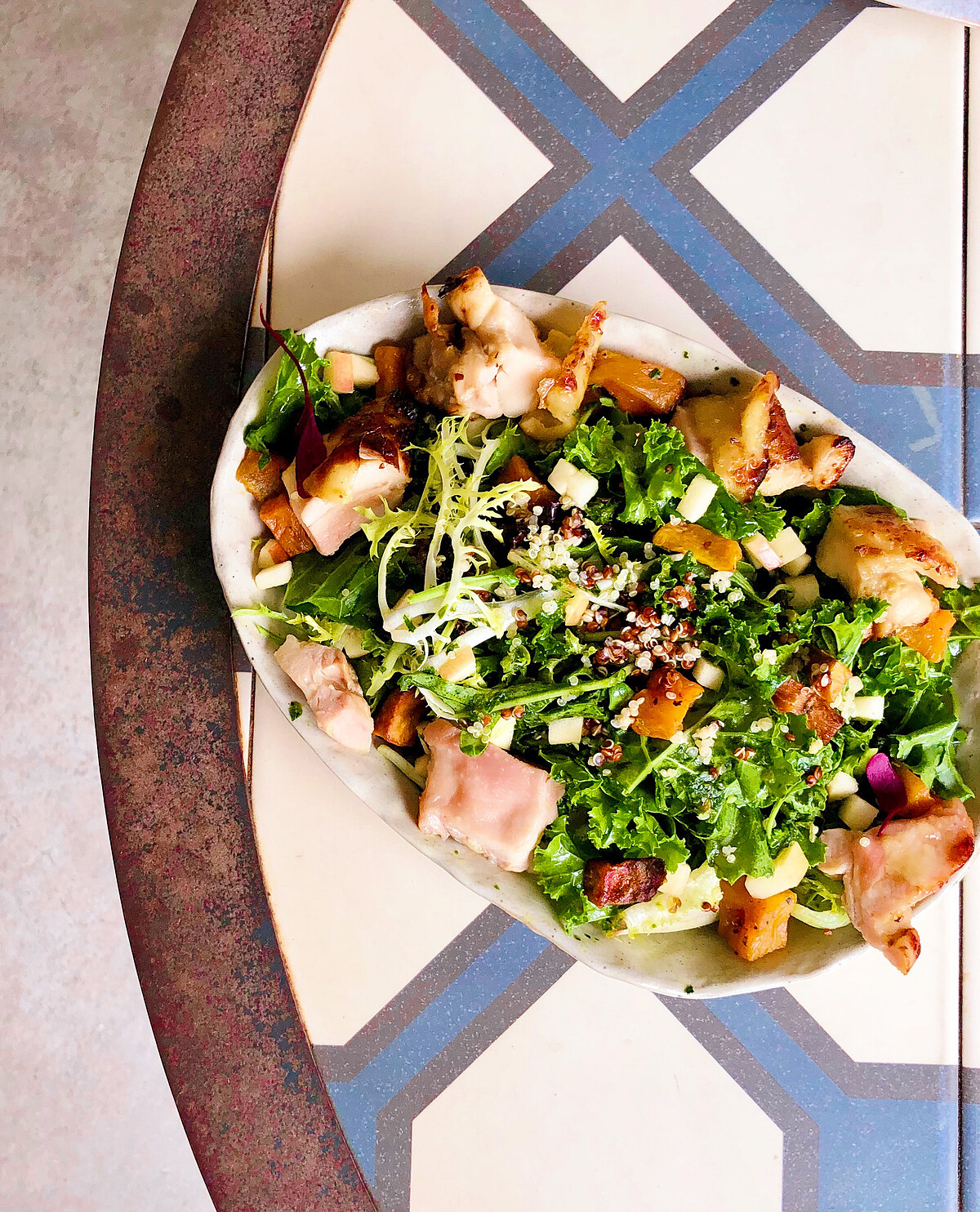 以營養價值極高的超級食物「藜麥」為主軸,再搭配羽衣甘蘭、毛豆及自製墨西哥青醬,以地瓜柔軟口感中和生菜爽脆,適度調味更加烘托藜麥清香,加入雞肉將整體份量提升,即使減肥也能安心享用!