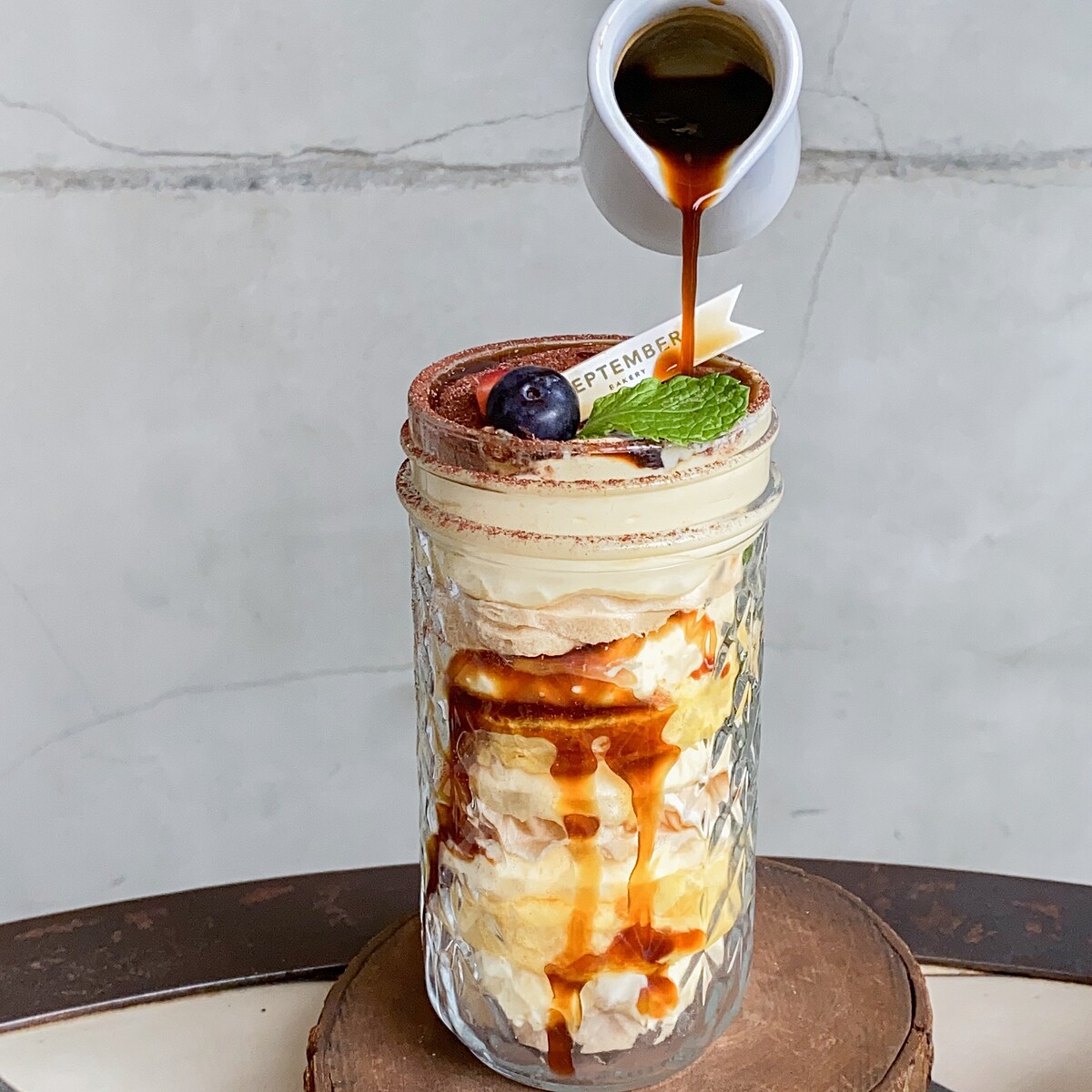 以伯可尼蛋白霜餅為基底搭配黃金原味蛋糕體,填餡為烘焙坊自製義式Mascarpone起司醬,在淋上咖啡酒及濃縮咖啡原液,多層次的風味口感讓人著迷!