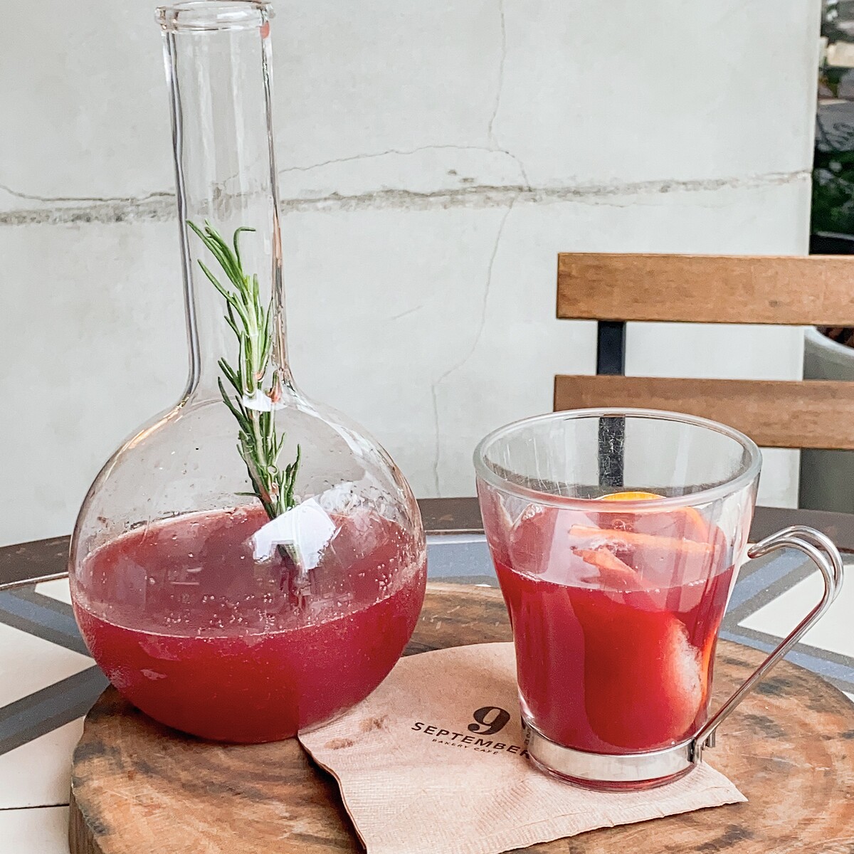 喜愛酸甜茶飲的人首選推薦!將蔓越梅汁、蘋果汁、紅酒及月桂葉一同熬煮,完成後放入迷迭香提升香氣飲用時承入裝有肉桂棒、柳橙片、蘋果片的杯中,果香四溢!