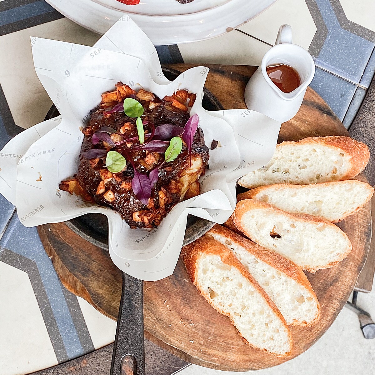 獨享完整一塊布里起司搭配焦糖洋蔥、煙燻培根及糖炒蘋果泥點綴牛血苗,享用時依照喜好淋入蜂蜜,搭配現烤法棍切片,每一口都超療癒!