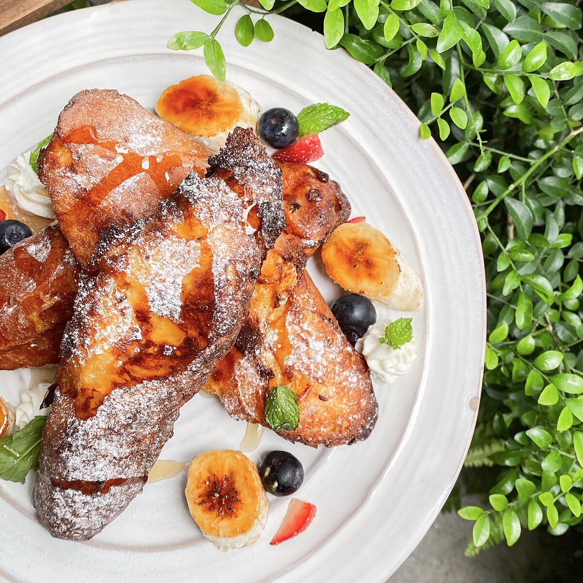 以烘焙坊自製法棍浸泡蛋液一夜,風乾後烘烤,酥脆外皮與濕潤柔軟麵包體相互呈現,綴以適量楓糖醬與當季新鮮水果,甜點控們的首選非它莫屬啦!