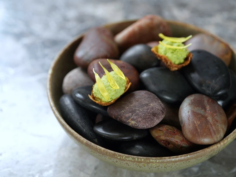 將菊芋清蒸後去肉,風乾外皮再炸,接著填入以醬油、山葵調味的毛豆泥,其上再綴飾新鮮菊花瓣。搭配清爽的蘆筍清湯,由於蘆筍本身含水量高,並不易料理。主廚經過逾10次反覆調整後,才製成這款風味清甜純粹又暖胃的湯品。