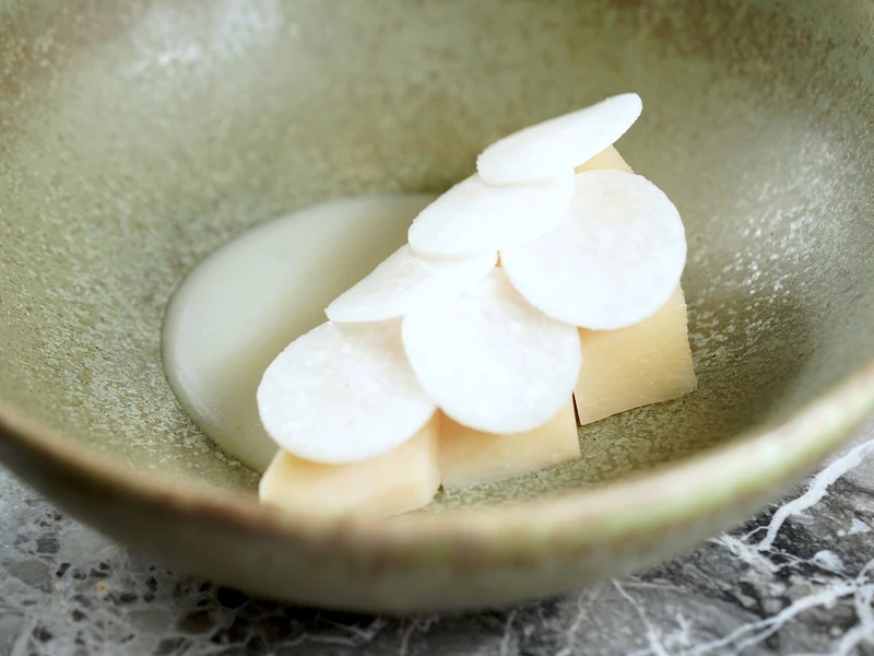 取出後放入前述的米湯中,並搭配發酵過的豆薯薄片,化繁為簡將食材本身最美好的滋味演繹的淋漓盡致。