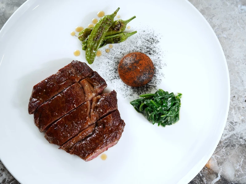 嚴選口感柔嫩、油花分布均勻,具有獨特風味的日本F1國產紐約客牛排,將其烹製成完美熟度後,再佐以主廚用洋蔥、番茄、蜂蜜、醋和醬油製成的祕製洋蔥泥醬汁。