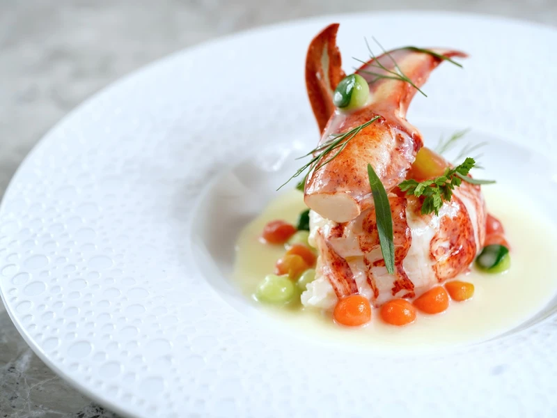 主廚以此手法蒸煮龍蝦,使龍蝦肉質鮮嫩彈牙,接著將蔬菜高湯濃縮過濾成醬汁,續入小黃瓜、番茄等蔬菜,運用蔬菜的清甜襯托出龍蝦的鮮味,打造出讓人允指回味的絕妙滋味。