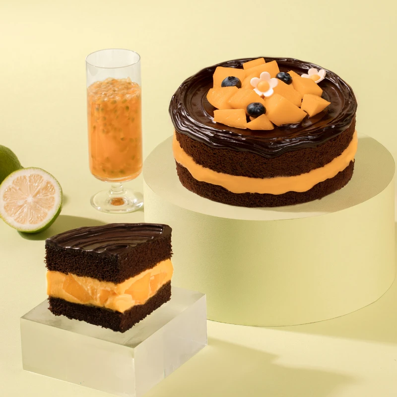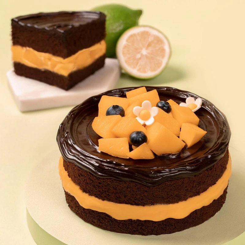 將新鮮芒果鋪滿內餡外,在外層堆上新鮮芒果果塊,整顆蛋糕增加30%芒果果塊,讓大家口口都能吃到新鮮台灣芒果,以芒果尬香濃巧克力的獨特組合,打造出酸甜迷人的療癒風味!