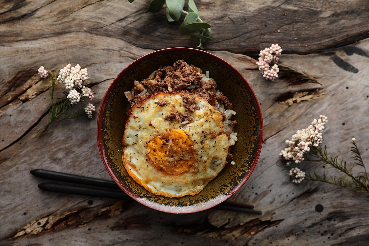 以馬告、刺蔥、魚露與柴魚醬油熬煮醬汁,以牛肉燥取代豬肉燥,除了選用澳洲牛肉,更加入相思木油慢烤澳洲牛筋,牛筋的彈脆展現與眾不同的咀嚼口感。