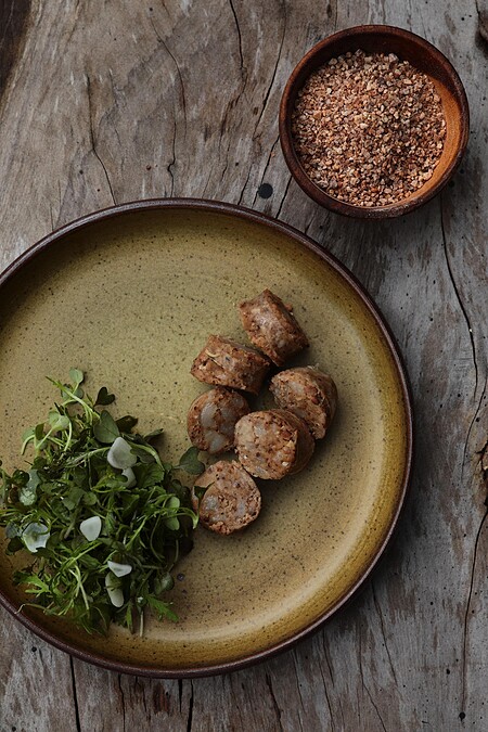 此外,主廚更以原住民常食用的樹豆取代黃豆發酵,加上小米,變成小米味噌醬,整大家入口感受檸檬香、胡椒味的刺蔥,產生衝突與對比,吃雞腿排時不膩口,刺蔥味噌的甜味也能取代糖的添加。再加上馬告、土當歸、月桃葉等原住民辛香料調味,味道深邃富有層次。