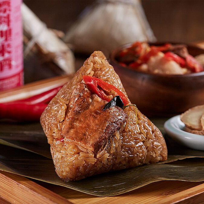 把台式熱炒店靈魂菜加入粽子,內餡去骨雞腿肉吸收充滿老薑、蒜頭、辣椒香氣的經典麻油三杯醬汁,米香中伴隨著超道地的家鄉味,讓人吮指回味,口齒留香。