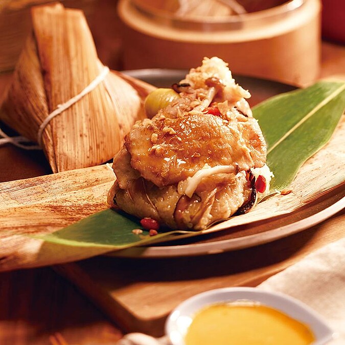 典美味創意變身,一整大塊的松阪豬肉,被飽吸薑香與麻油味的糯米包裹住,裏邊還有滑嫩的鴻喜菇、鹹蛋黃等豐盛內餡,澆淋特製辣醬再灑上咸香油蔥酥,畫龍點睛的提味讓經典美味更加分難忘~快來一口飽嚐粽香與麻油香的絕配滋味吧!