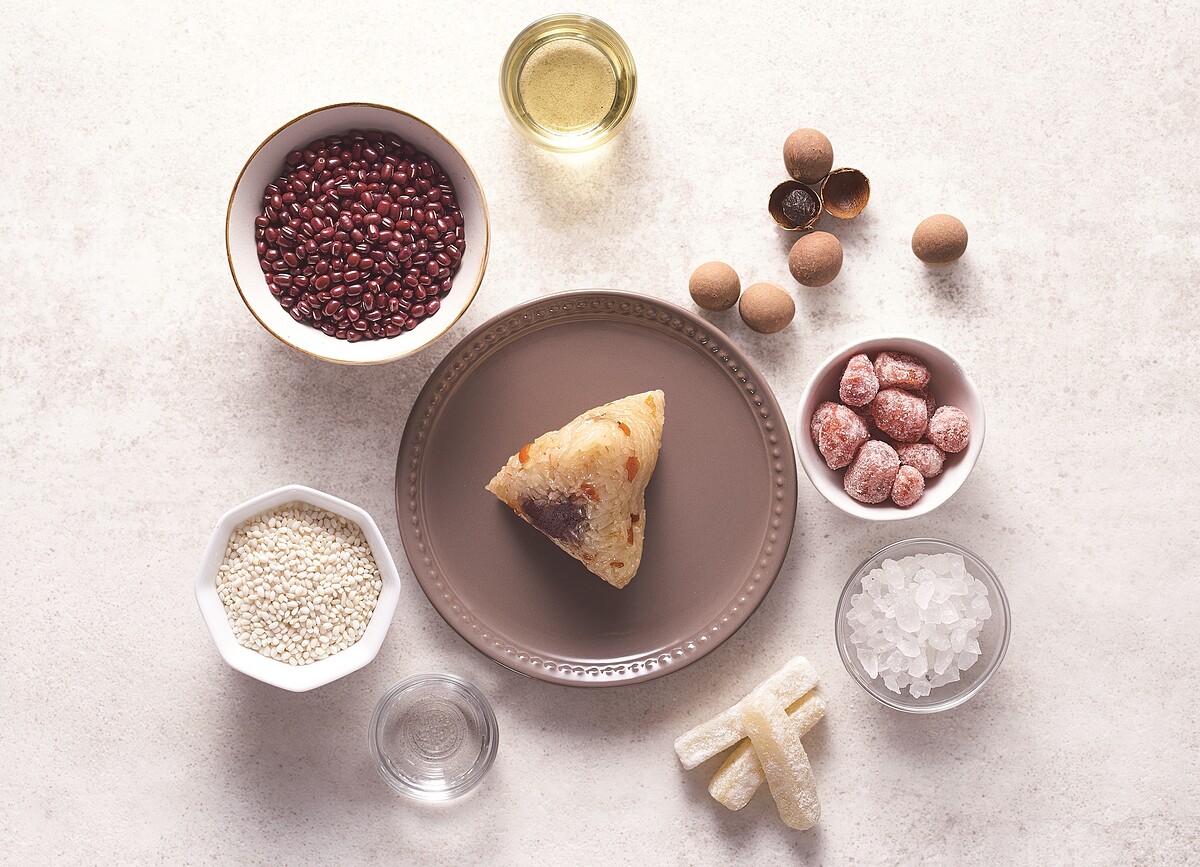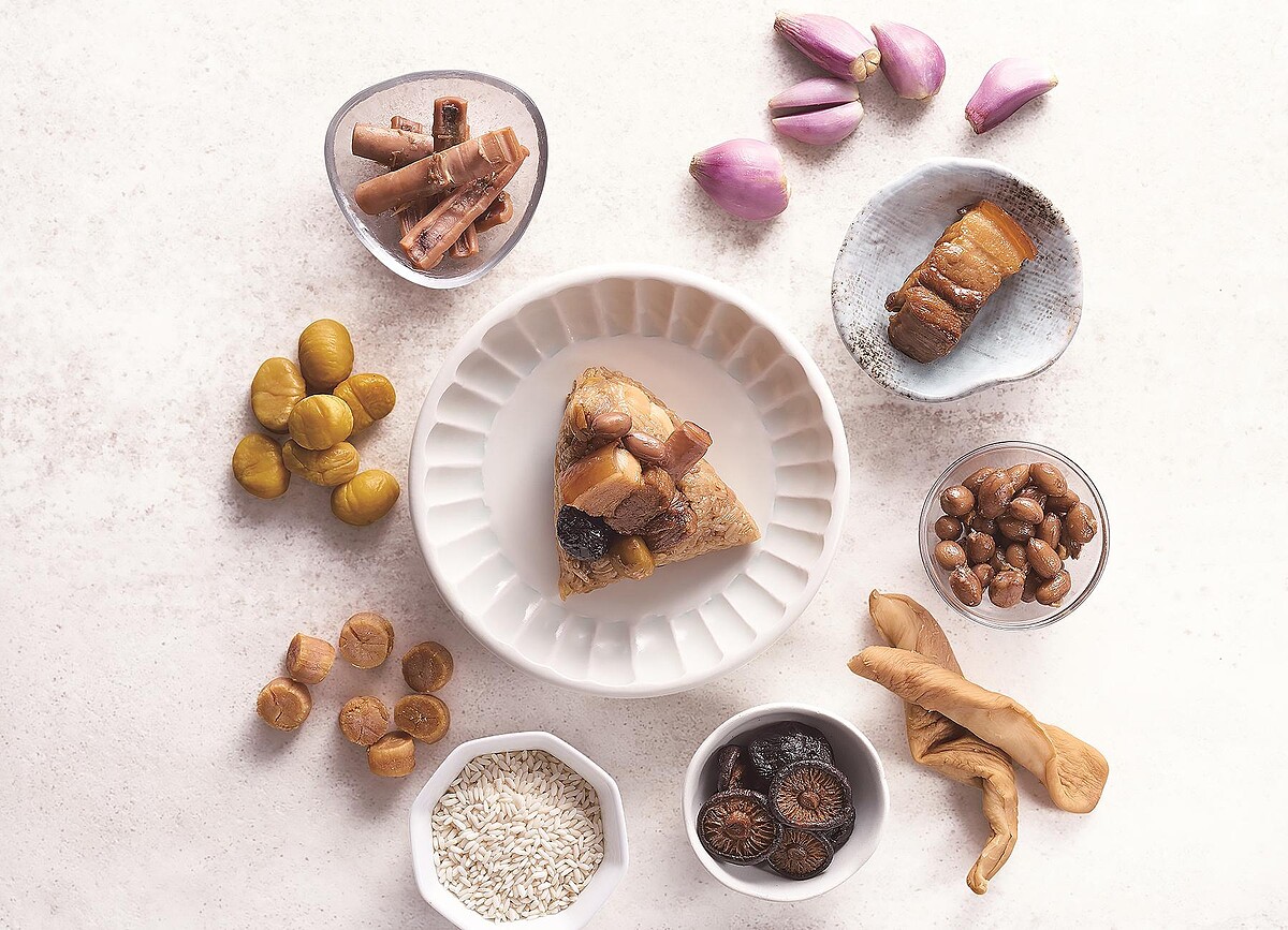 食材選用台南福圓乾、台東冬瓜條、宜蘭桔餅等懷念的傳統食材;古法製作、不含人工添加物的桔餅,讓粽子散放出淡淡清香果味;新鮮龍眼遵循古法烘乾燻焙的福圓乾,有著樸實的甜味,蒸煮後再切碎拌入,更增添了香氣的層次與醇厚的風格;為了做出精純質濃甜度均的紅豆內餡,主廚精選佳穩定氣味足的萬丹紅豆,吃法也如點心般,蒸熟後放涼了吃口感更佳,清香不膩口!