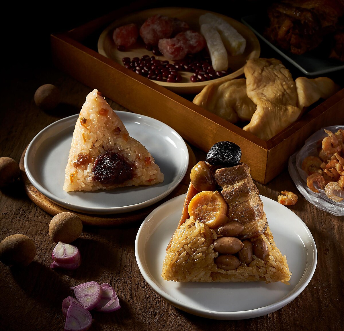 客家粿粽:糯米經研磨、瀝乾、搓揉成粄糰,以粽葉包起蒸熟;臘味鮮肉粽:嚴選風乾數日的港澳道地臘腸與肝腸,融合肉質鮮嫩的黑毛豬梅花肉與爽口圓糯米。