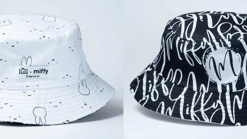 雙面設計的可反戴式漁夫帽,兩面的風格迥異,一面黑色帶有白色慵懶字體的藝術個性風,一面是白色黑線以miffy作基礎的幾何圖形,適合不同穿搭風格非常實用!