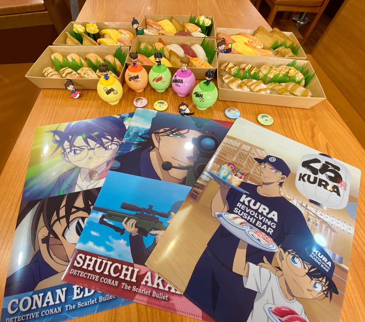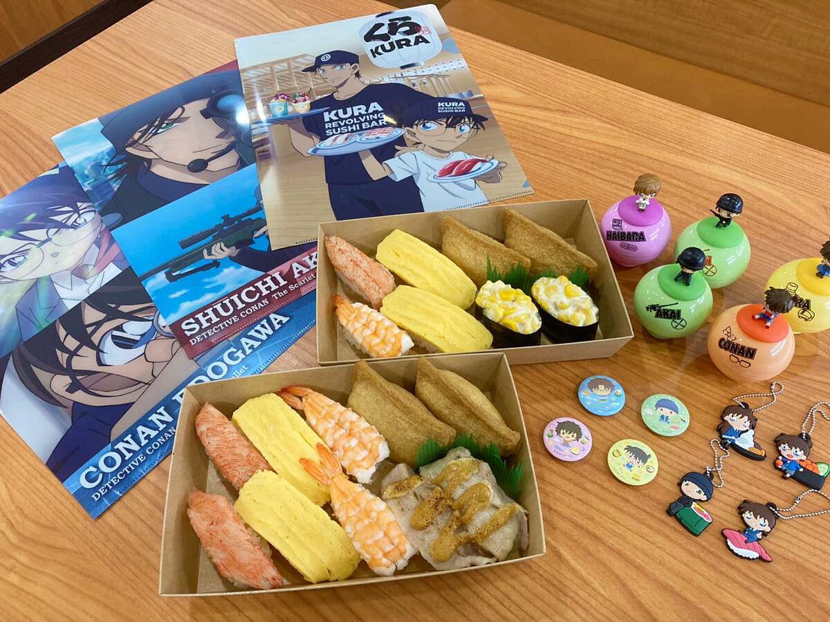 凡來松江南京店消費每KURA外帶一盒,即贈送名偵探柯南扭蛋一顆(一盒一顆扭蛋、2盒2顆...以此類推);加碼消費滿500元就可即刻將「名偵探柯南:緋色的彈丸」限量1枚文件夾帶回家收藏,消費1,000即贈送2枚檔案夾以此類推數量有限送完為止,共有3個款式,每一款文件夾上分別收錄了電影中的經典場景,讓影迷們能一邊吃壽司一邊回憶電影中的精采橋段。